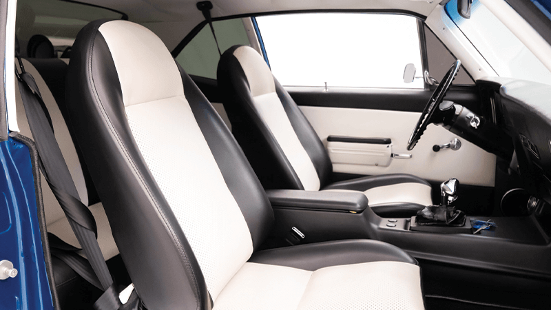 Inside, the Nova balances vintage appeal with everyday usability. Leather-and-vinyl upholstery gives the cabin a custom feel, while air conditioning adds welcome comfort for warm-weather driving.