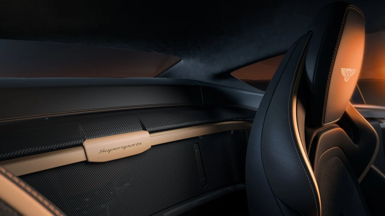 There’s more carbon fiber outside, where Bentley used the lightweight material for the lower front bumper/splitter combo, stacked front dive planes, front fender blades, roof, side skirts, diffuser, and fixed rear spoiler. Bentley co-developed the new 22-inch wheels with Manthey Racing, a name familiar to Porsche enthusiasts. Two tire options are available: Pirelli P Zero and P Zero Trofeo RS, the latter of which helps the Supersports corner approximately 30 percent faster than a Continental GT Speed and pull up to 1.3g of lateral force. Behind those big wheels is what Bentley calls “the largest automotive braking system in the world”: 17.3-inch (440-mm) Carbon-Silicon-Carbide front discs with 10-piston calipers, and 16.1-inch (410-mm) rear discs with four-piston calipers.