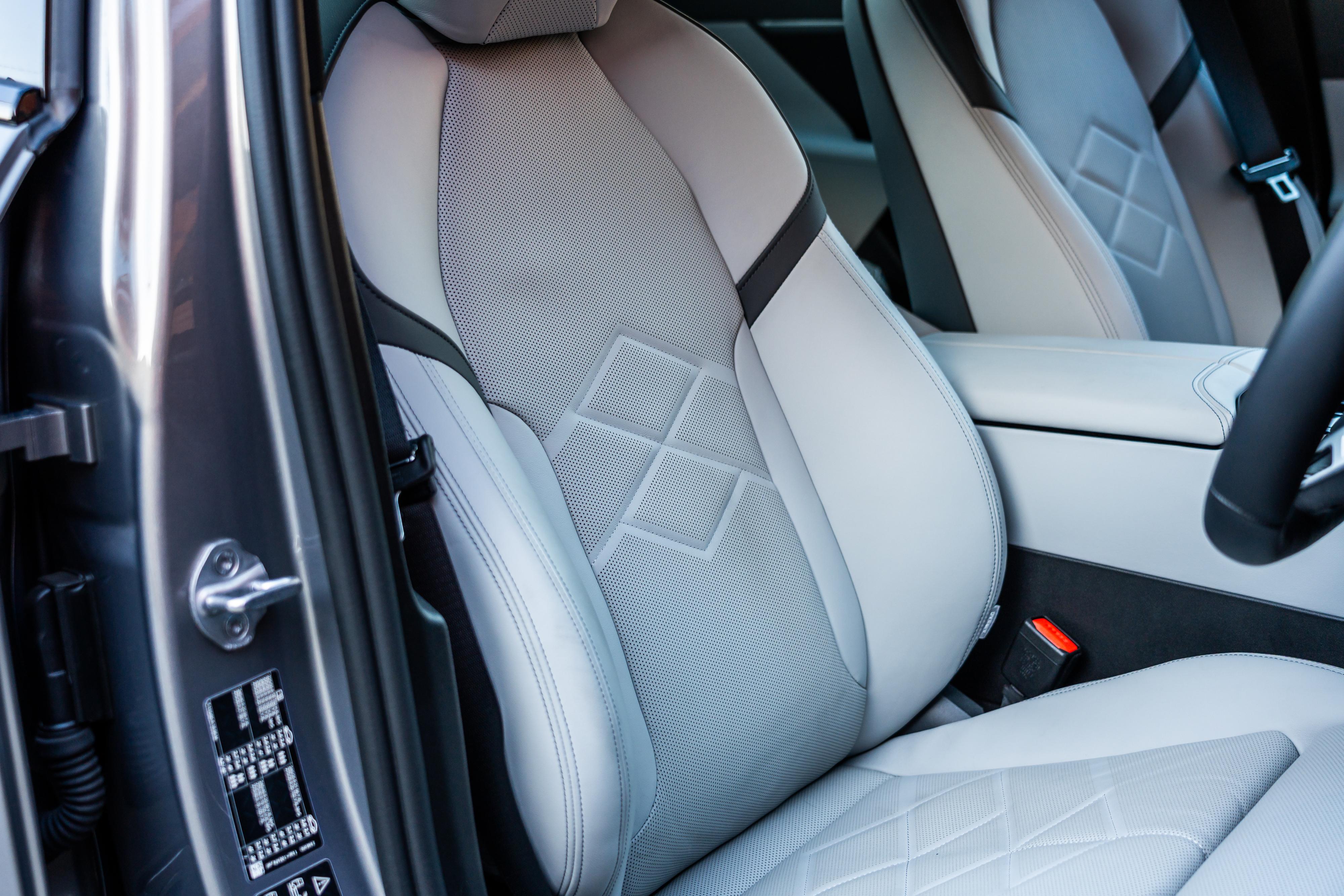 The leather-clad wheel is nice to hold, and the seats are comfortable with loads of adjustment. But as flashy as it looks, the optional off-white upholstery was already starting to get grubby in our relatively low-mileage tester.