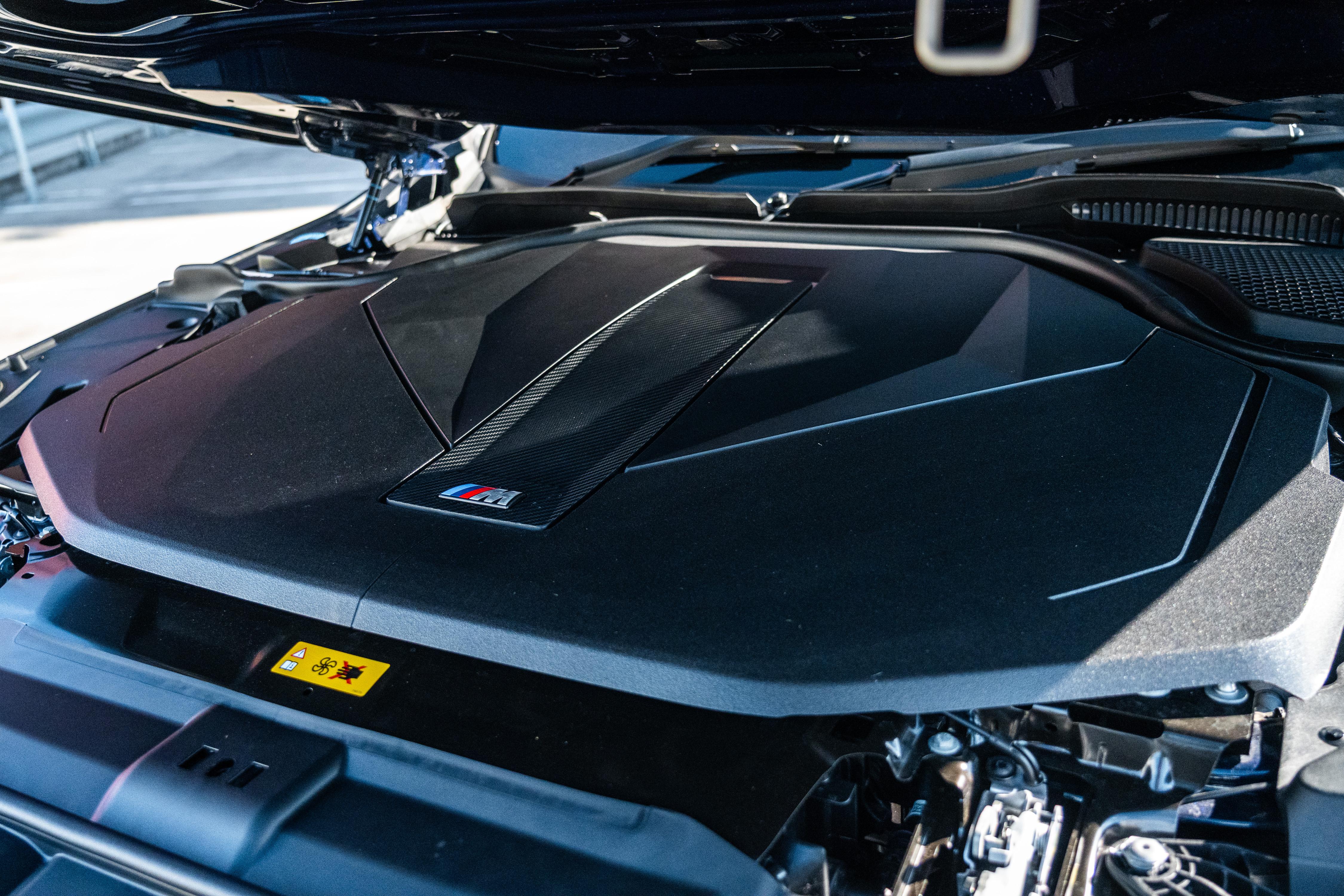 A massive black plastic shroud festooned with an M badge masquerading as an engine cover hides the electric gubbins. There’s an electric motor mounted on each axle to deliver all-wheel drive, as well as stonking outputs of 442kW of power and 820Nm of torque. And there’s a claimed 503km (WLTP) of range from a big 84kWh lithium-ion battery.