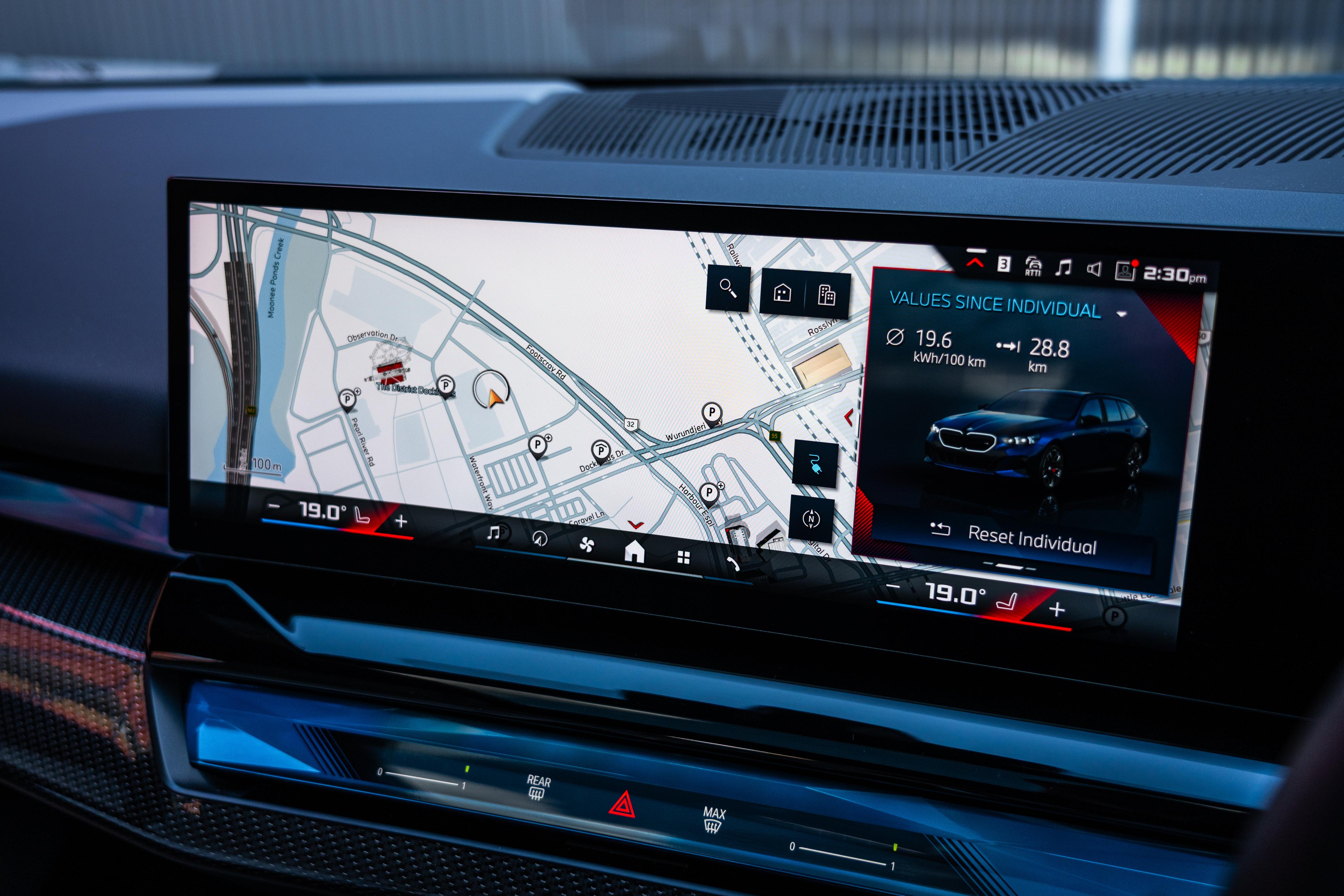 The leather-wrapped steering wheel rim has tri-colour M stitching – as do the seatbelt edges – and solid thickness, delivering a feeling of quality and giving the i5 M60 Touring a substantial feel on the road.