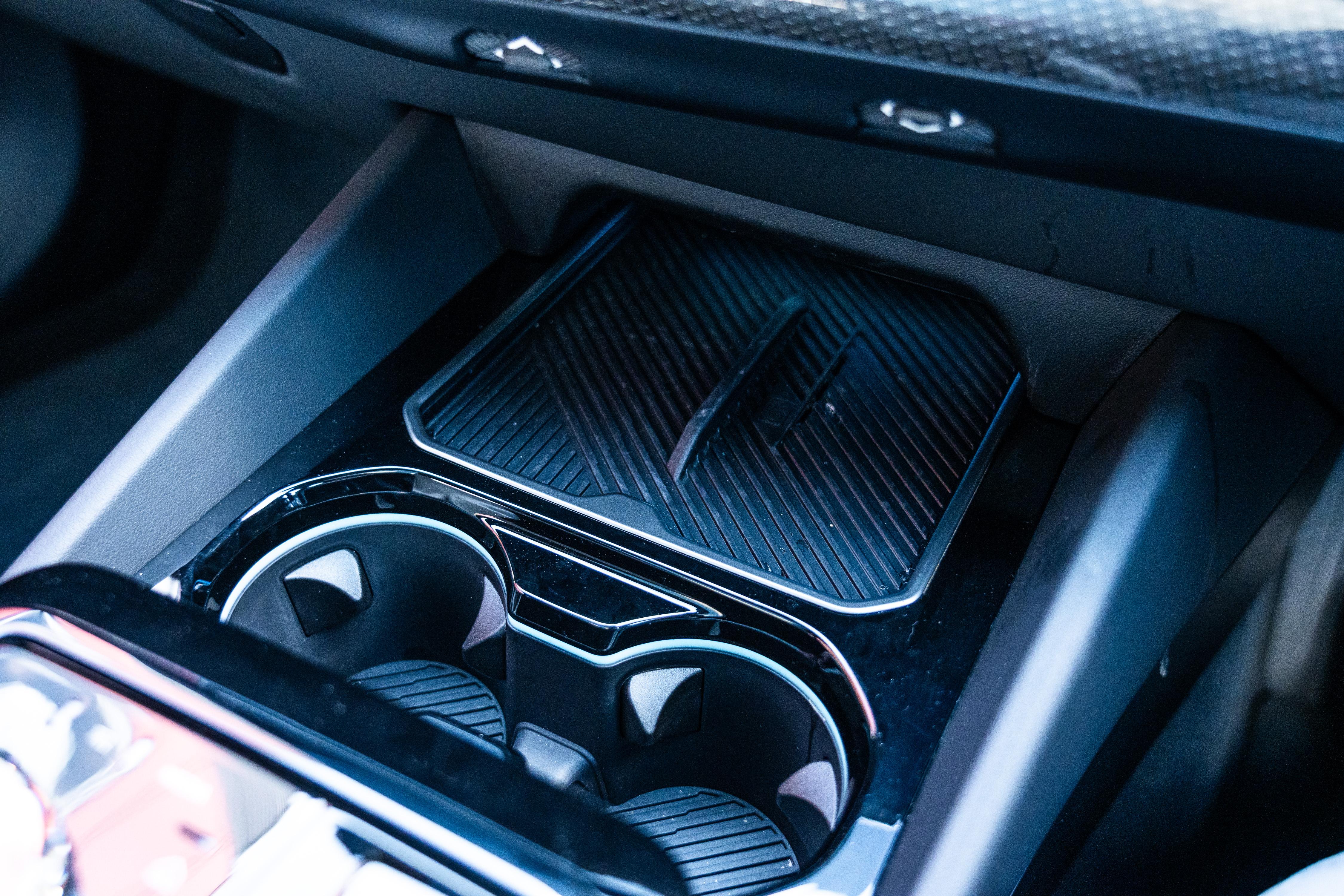 The roller volume knob sits ahead of a reasonably sized centre console, and closer to the dash there are two wireless smartphone charging spaces – although we had to remove the covers from some of our smartphones for them to operate, unlike in some cheaper cars.