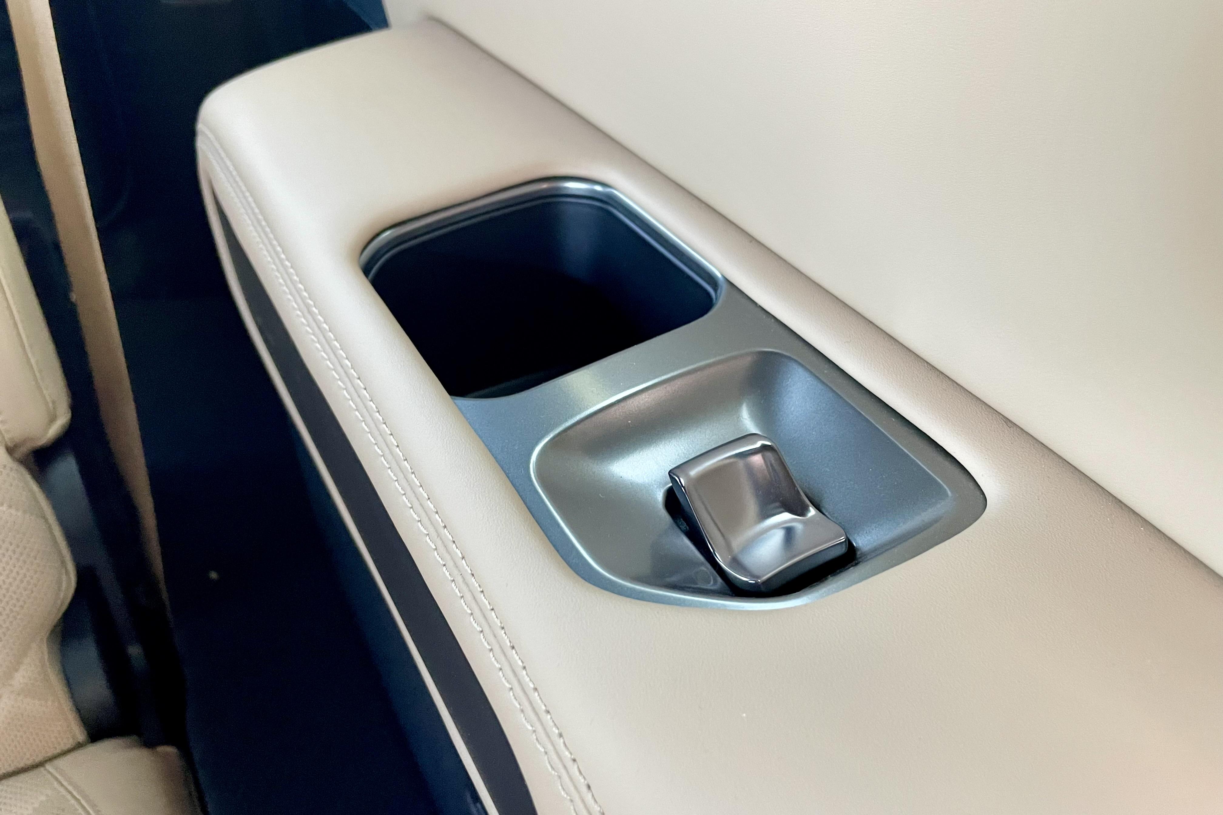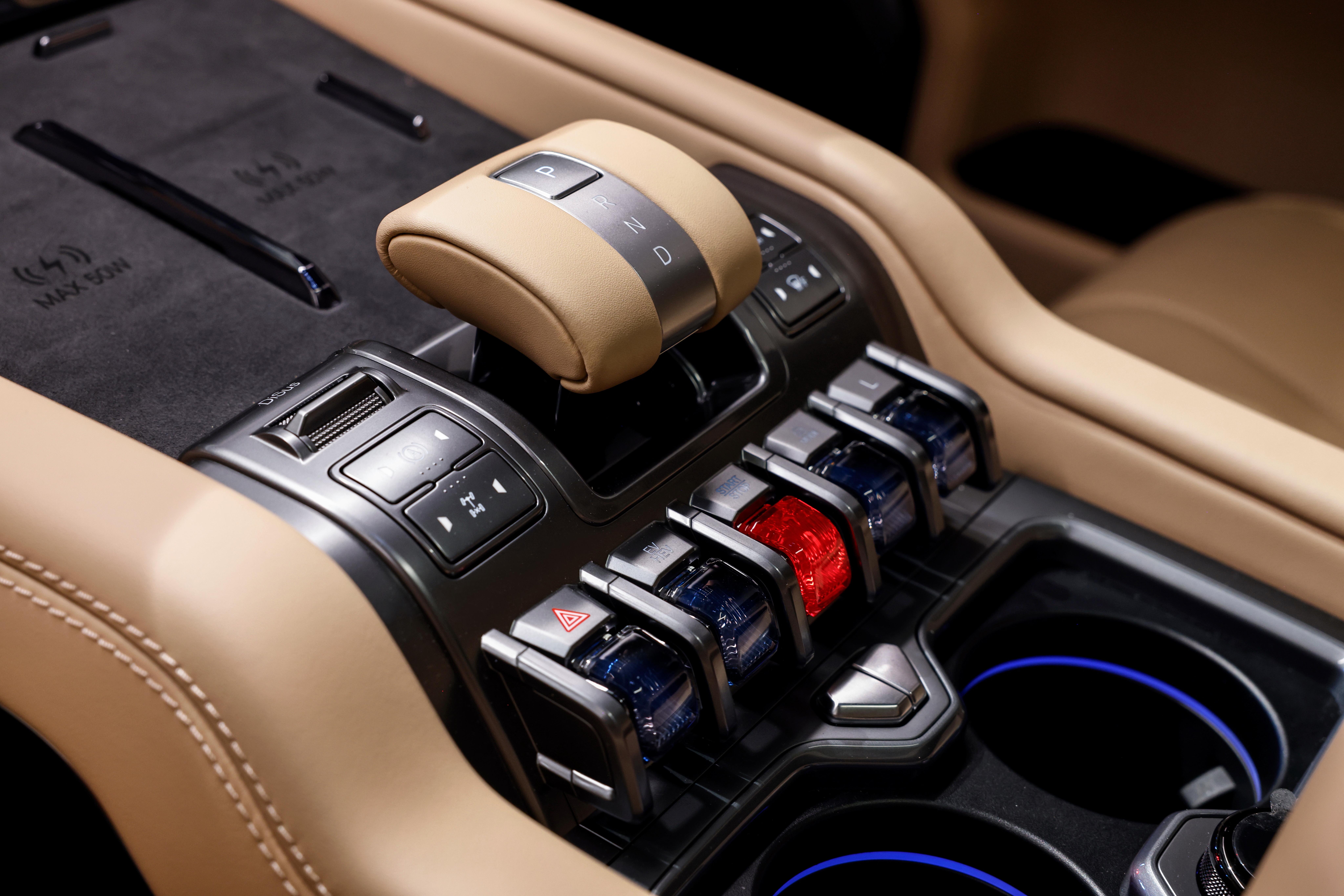 Above them is the gear selector, which automatically extends and retracts when you start and stop the car respectively. This gimmick is contrasted by the handy, height-adjustable cupholders nearby, along with the cooled and heated box under the padded central armrest.