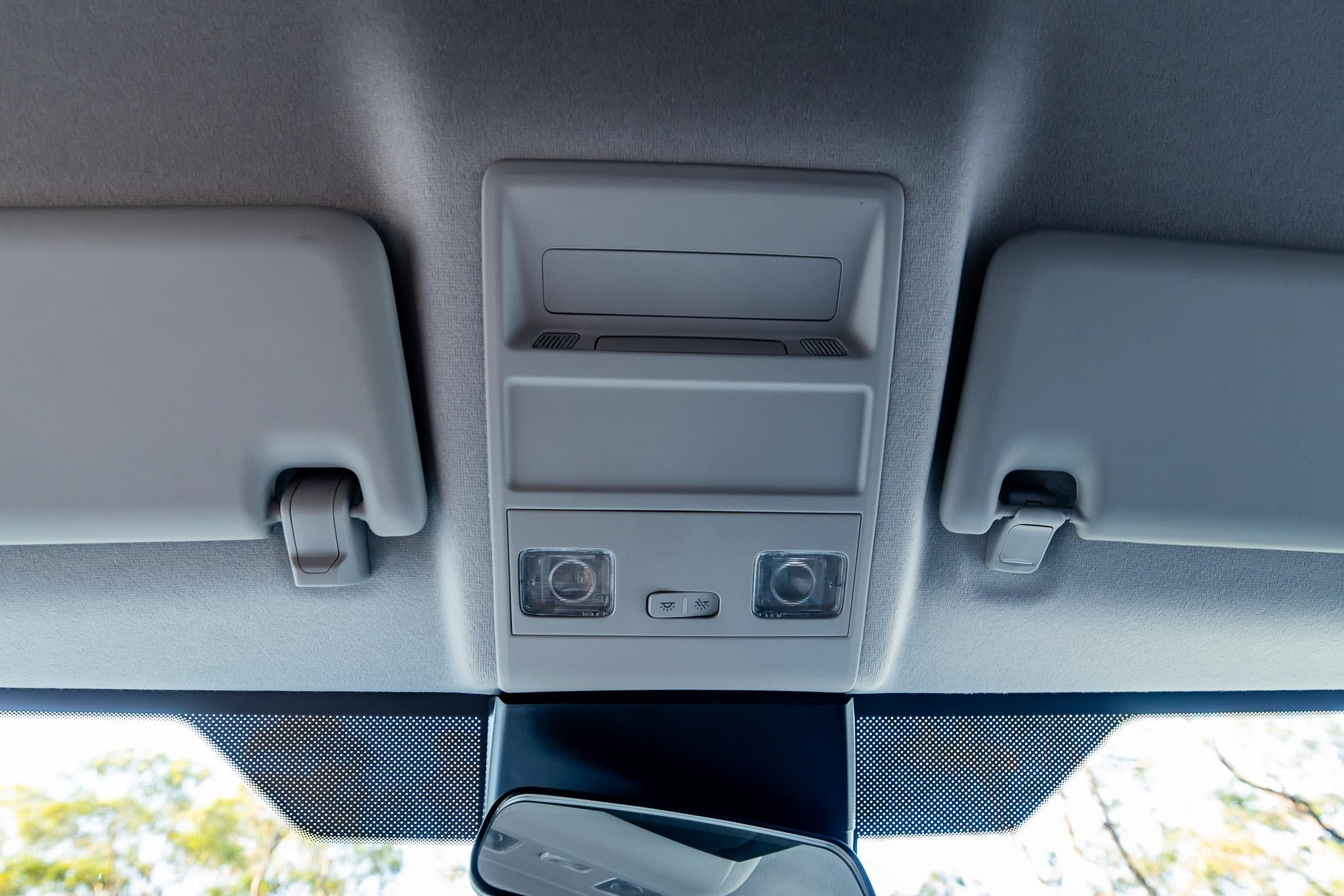 Overhead you do not get vanity mirrors, oddly, and the sun-visors aren’t extendable either. And while your view out the rear-vision mirror is not terrific, it’s also not auto-dimming – I reckon a digital camera mirror would be a nice upgrade.