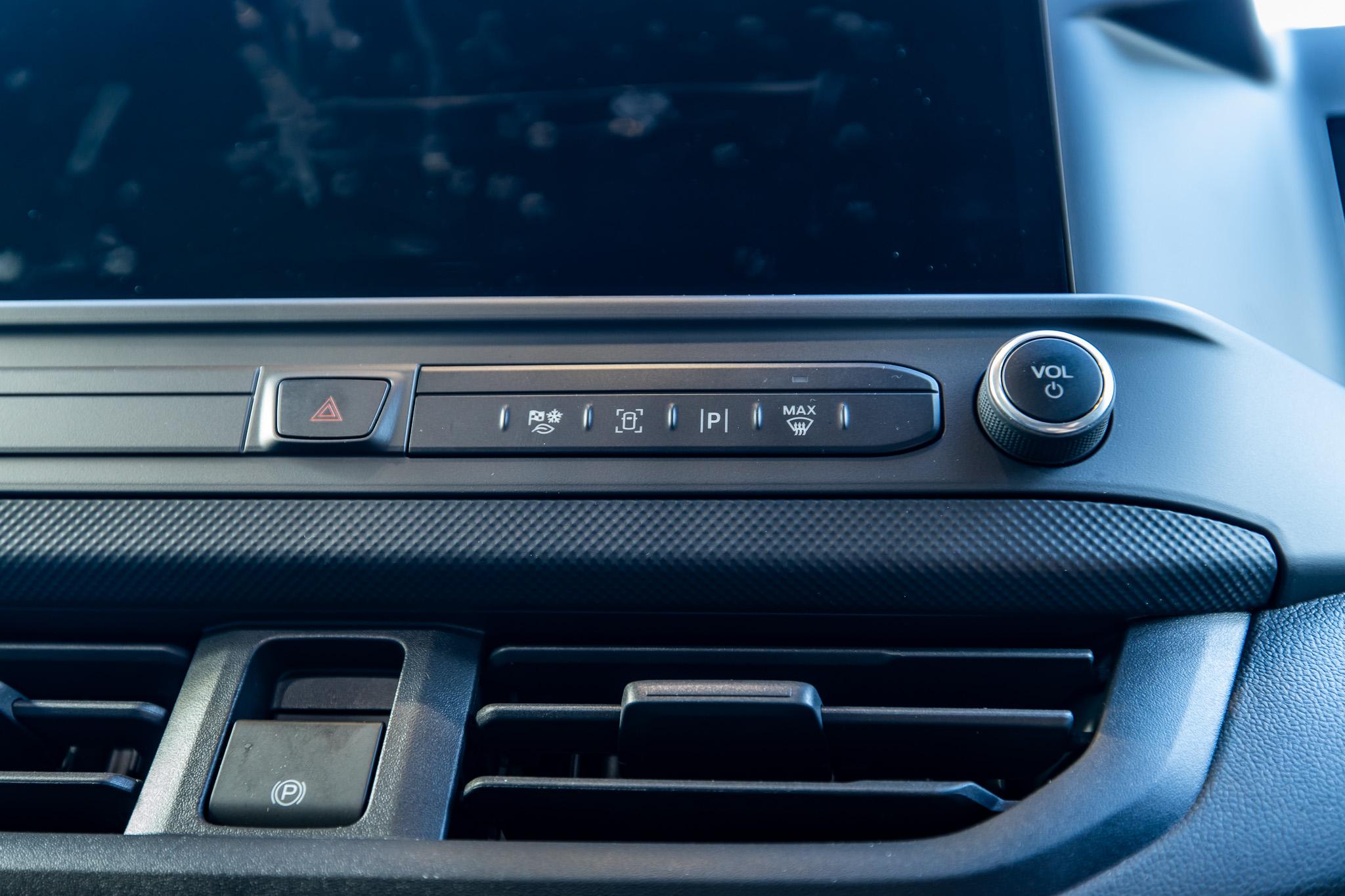 Below it is a small panel of physical controls, including drive mode selection, safety systems, and auto parking tech, plus there’s a “max front demister” button for those cooler mornings.
