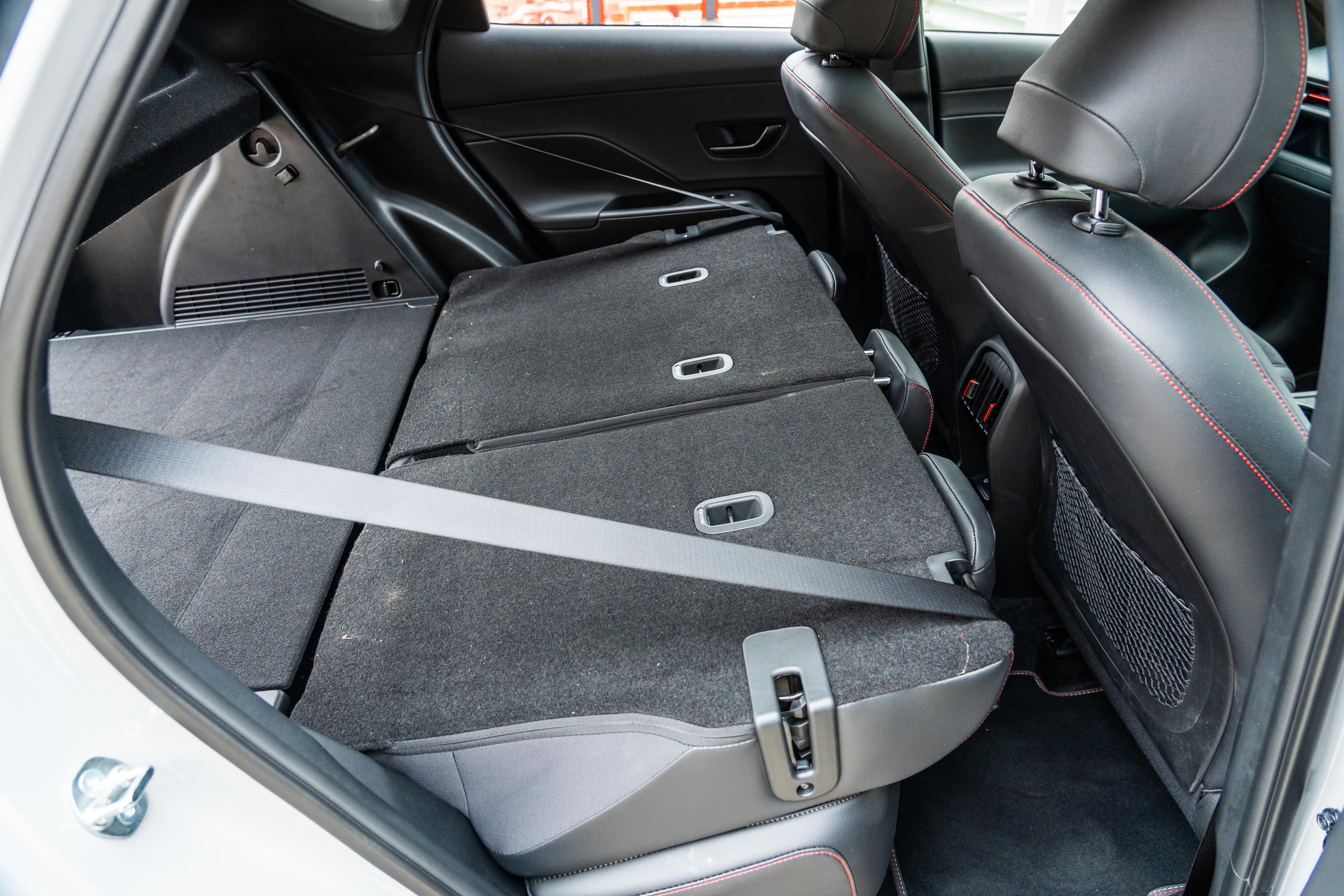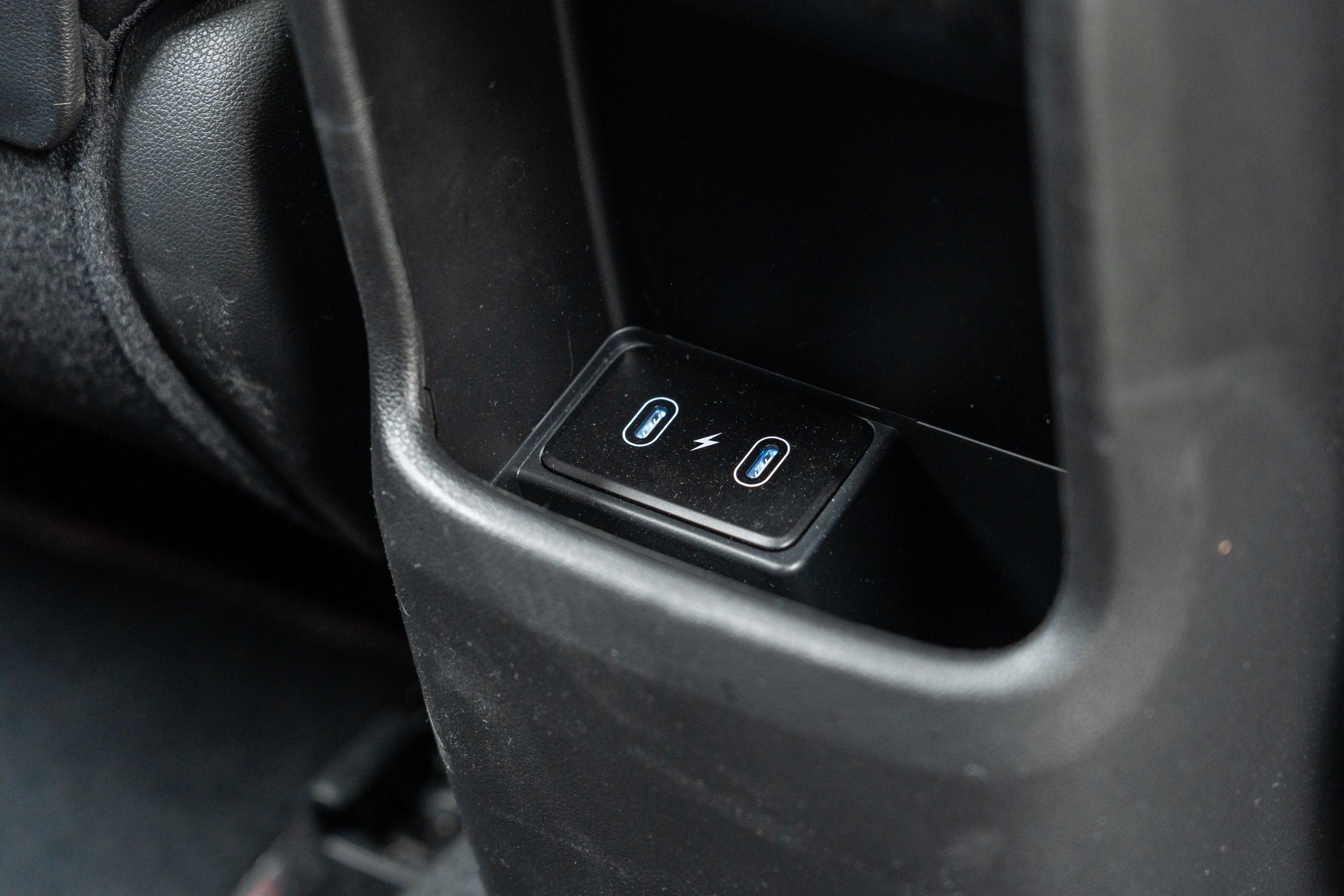 Thoughtful amenities include directional rear air vents, a pair of USB-C charging outlets, net-type rear seat pockets, bottle holders in the doors, and a fold-down centre armrest with cupholders.