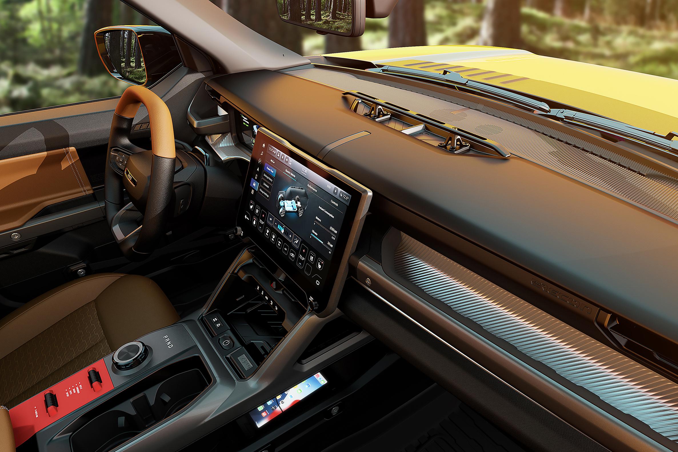 “The sleek, buttonless design blends futuristic aesthetic with practical usability, featuring digital buttons sized for ease of use in any terrain,” Jeep says, though it has retained physical knobs for volume and tuning.