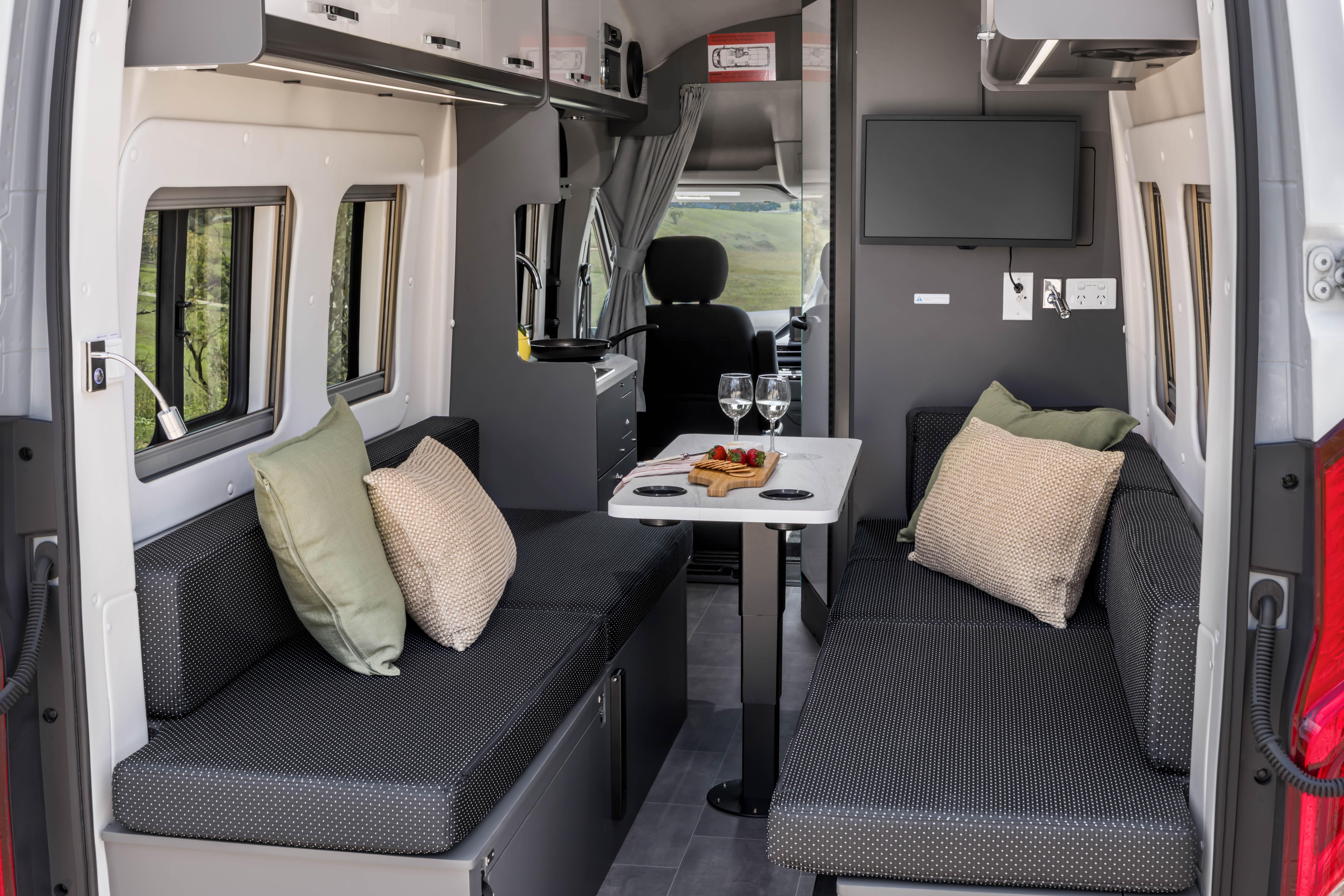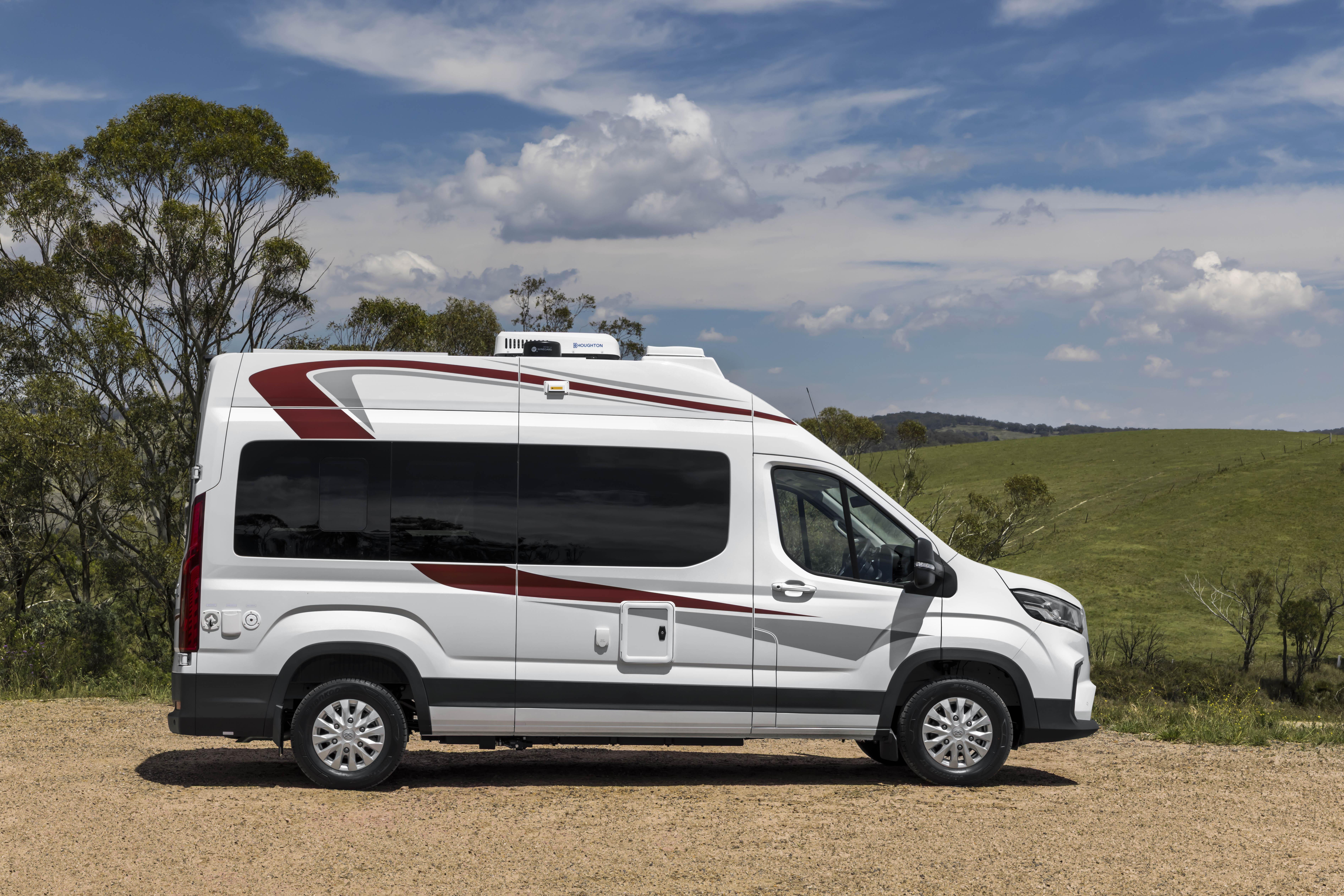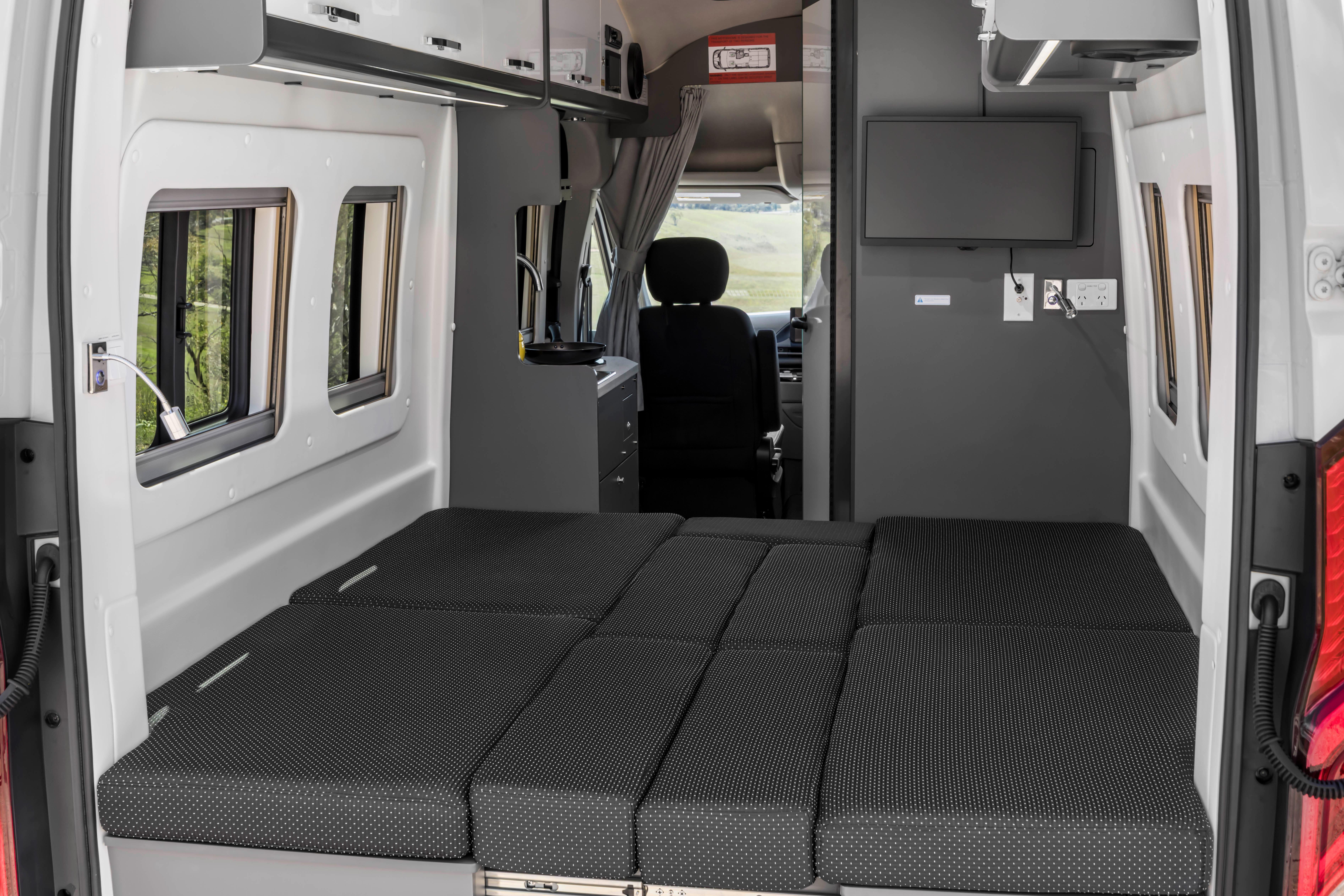 It also features a sliding passenger-side door with an electrically powered step; USB-A, USB-C and 240V outlets; and a 190W solar panel charging a 2.56kWh lithium-ion battery pack via a 2000W inverter.