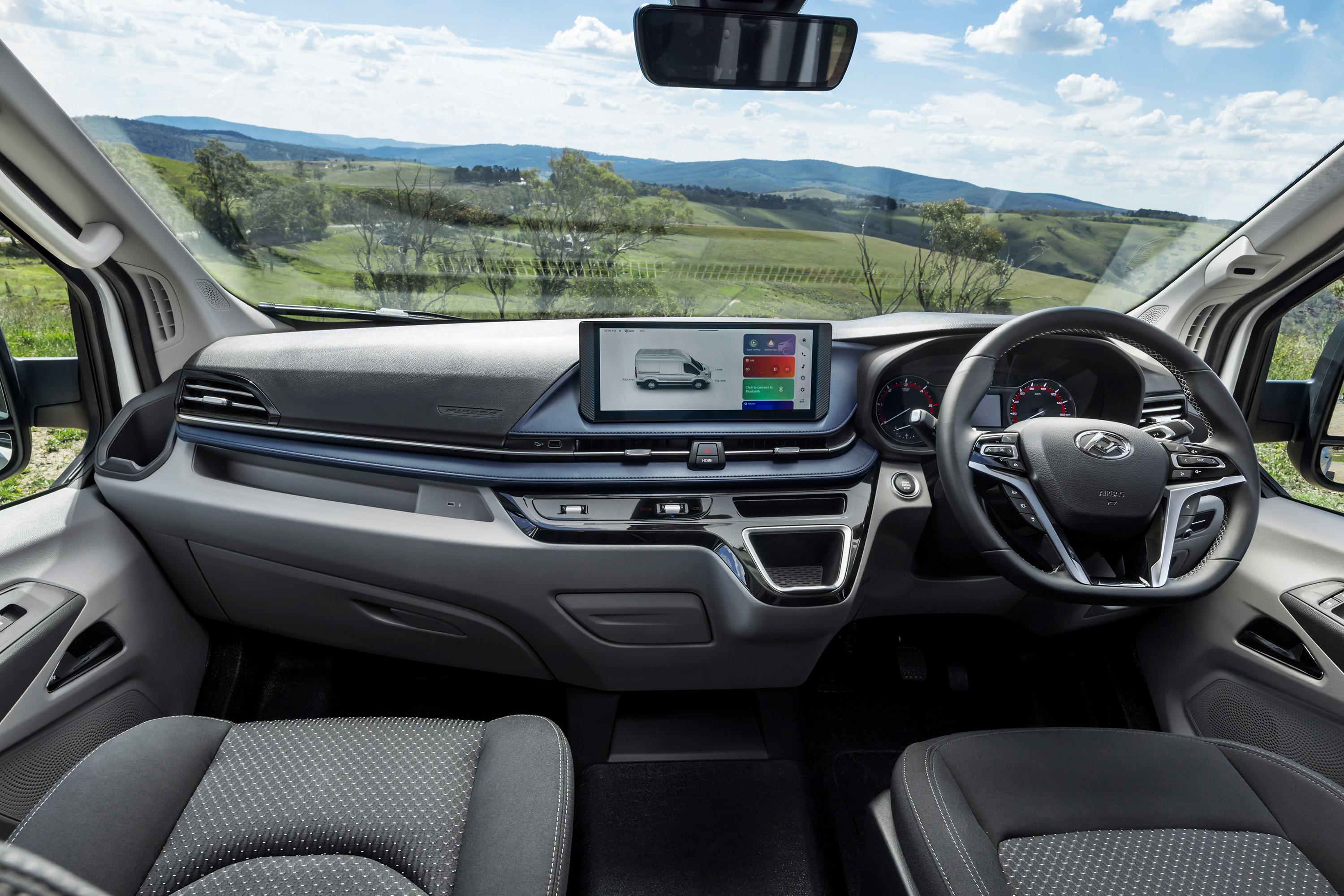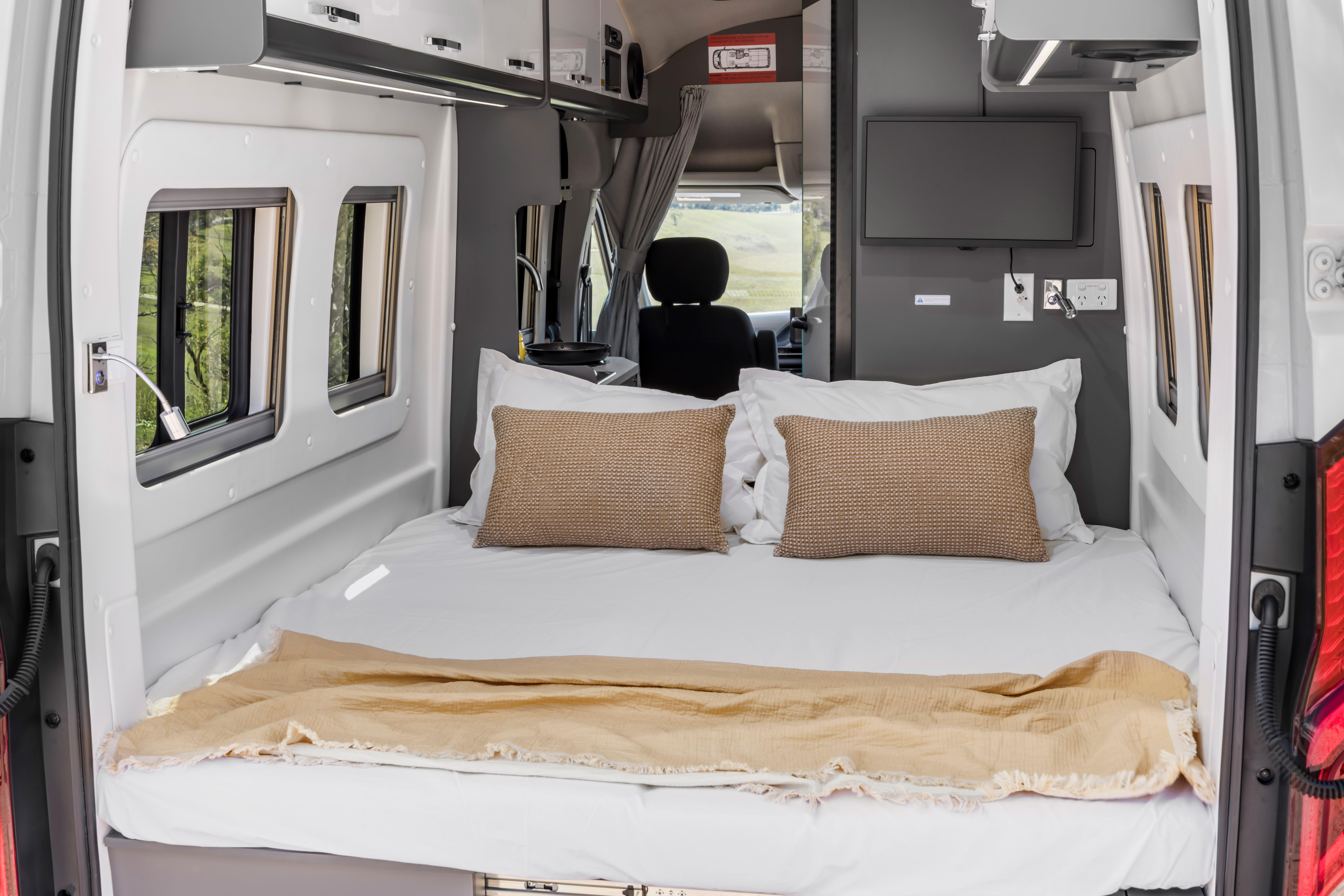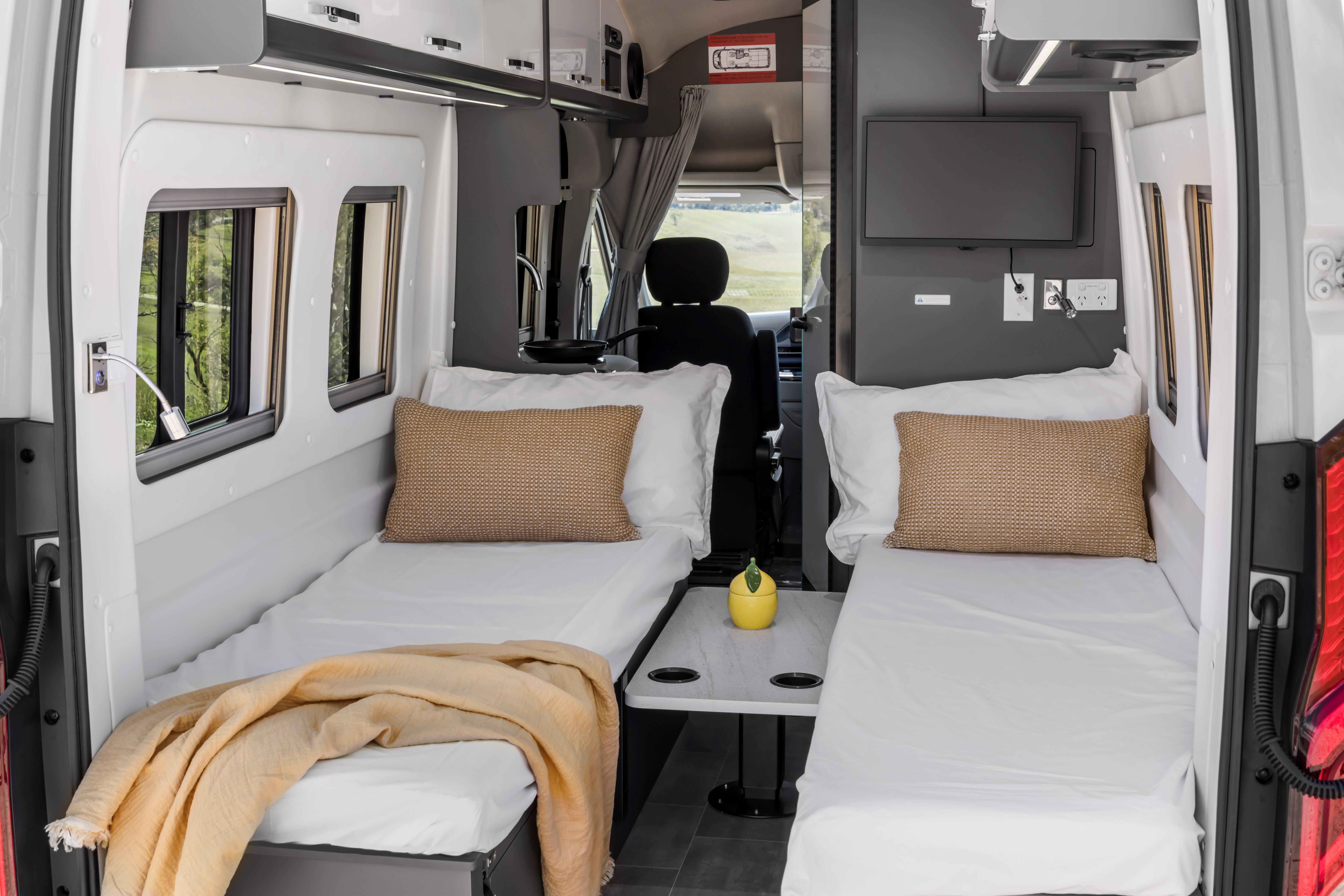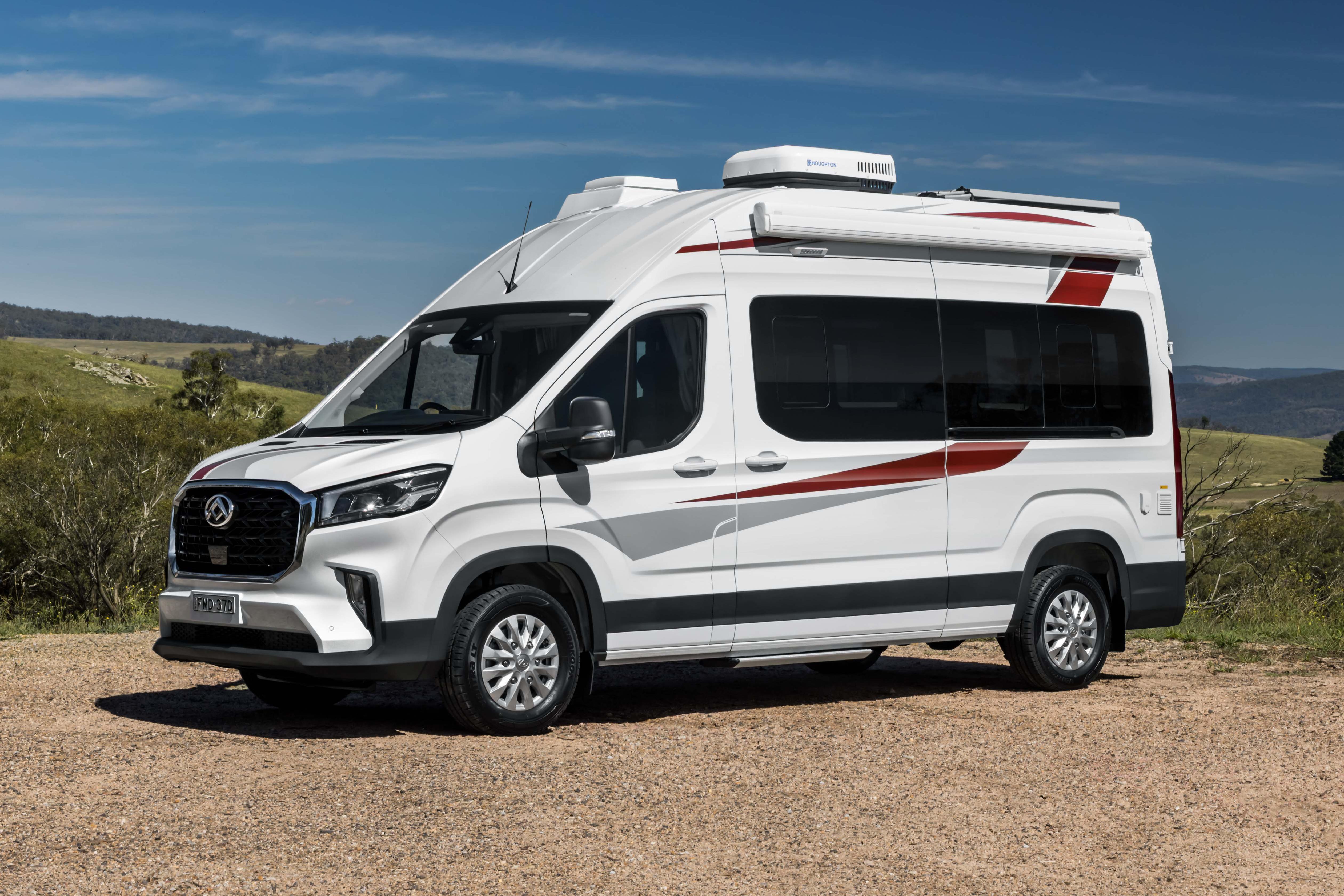 It also features a sliding passenger-side door with an electrically powered step; USB-A, USB-C and 240V outlets; and a 190W solar panel charging a 2.56kWh lithium-ion battery pack via a 2000W inverter.