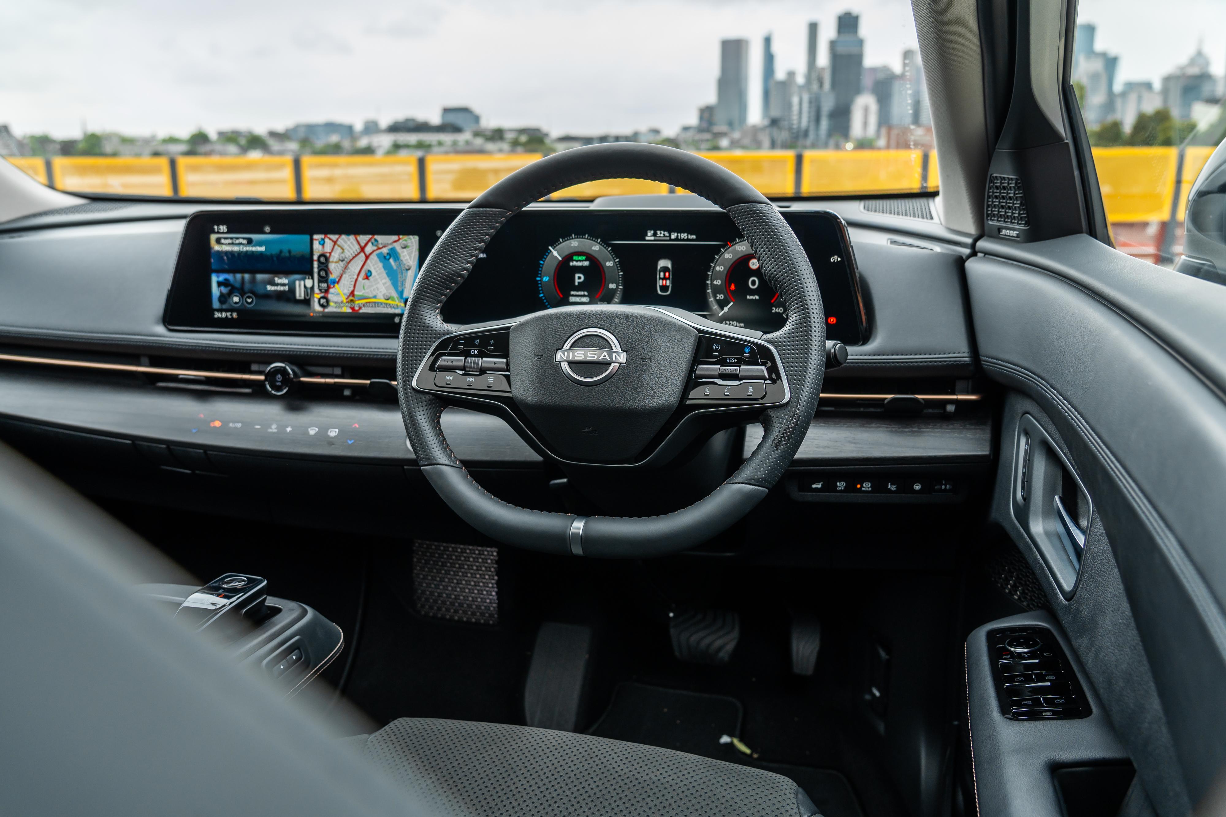 That’s not to say the Ariya is without mod cons. All Ariyas get twin 12.3-inch screens and a fancy haptic control panel, while the Advance+ brings a panoramic glass roof plus heating and ventilation for the front seats. The fuzzy reversing camera is a bit of a letdown, though.