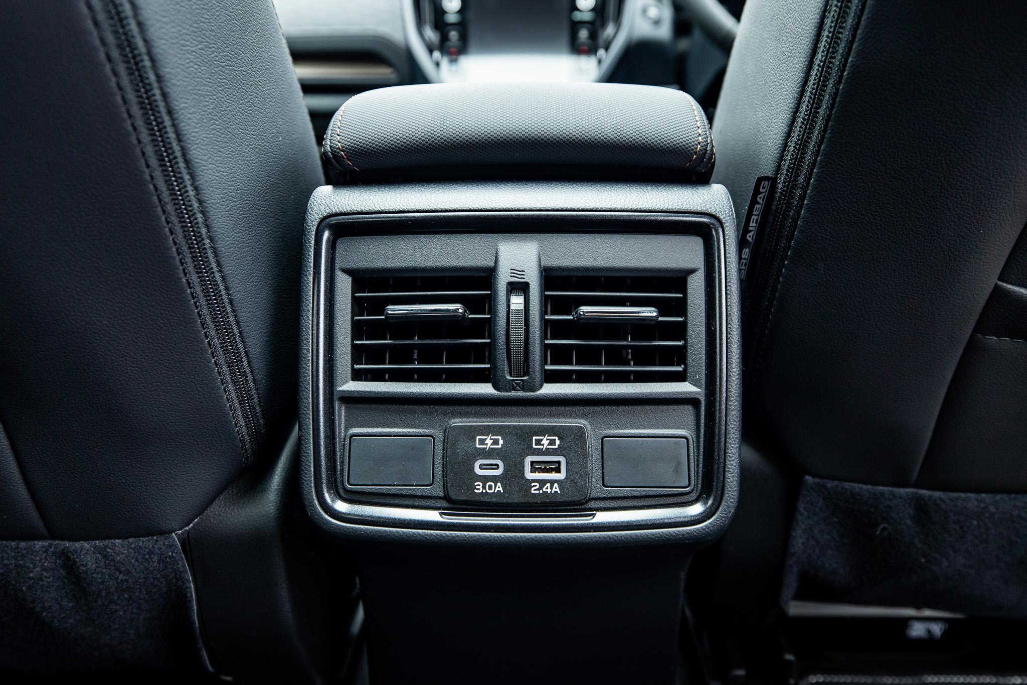 Subaru’s storage smarts run through to the rear, with multiple pockets on the seatbacks, door storage that fits bottles easily, and a flip-down armrest with cupholders.