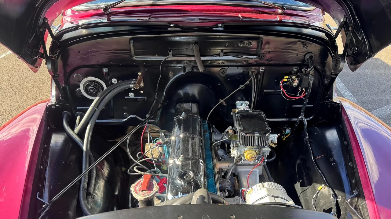 There’s more burgundy inside the cab, including the vinyl on the bench seat. Additional features include power steering, heater, windshield defroster, and floor-mounted manual shifter.
