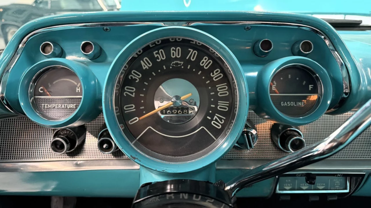 Instrumentation includes a 120-mph speedometer and gauges for the fuel level and coolant temperature. The odometer reads 16,968 miles, though the true mileage is unknown.