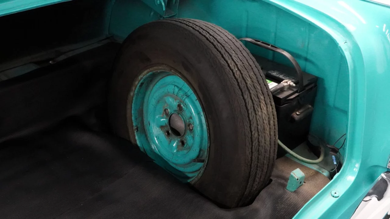 The cabin is furnished in turquoise with a split bench up front. Features include lap belts, power steering, column-mounted automatic shifter, tilt steering column, clock, aftermarket JVC AM/FM radio with cassette player, and more. The battery is mounted in the trunk, which also features a spare tire and vinyl mat.