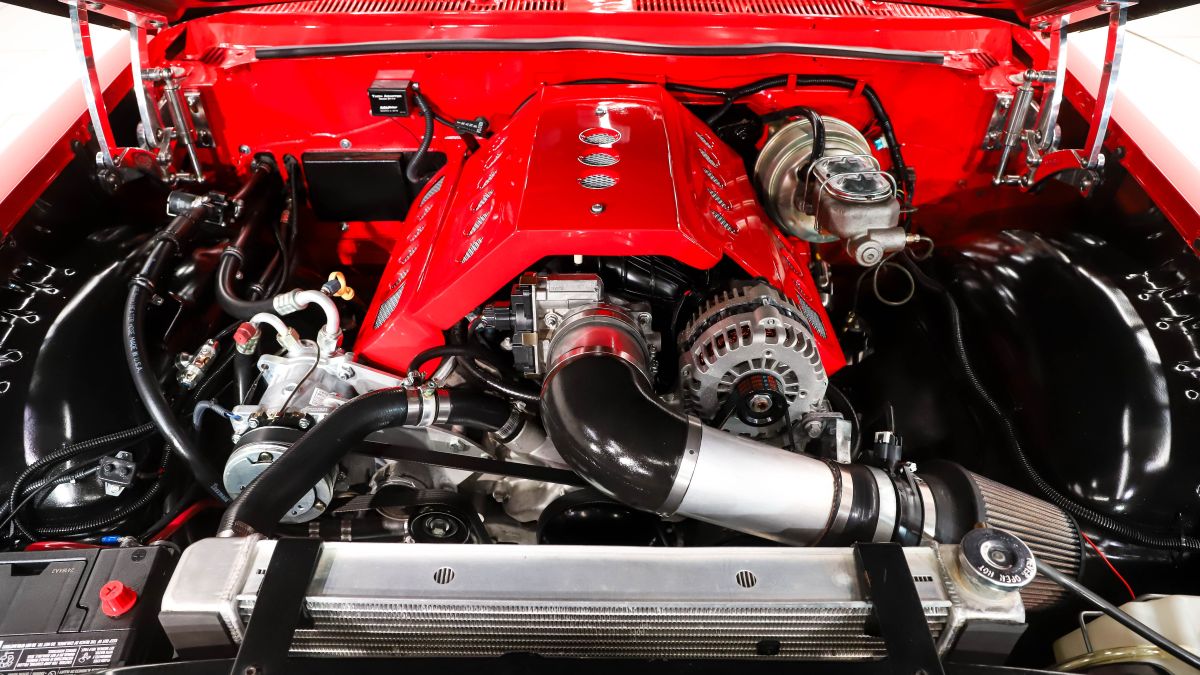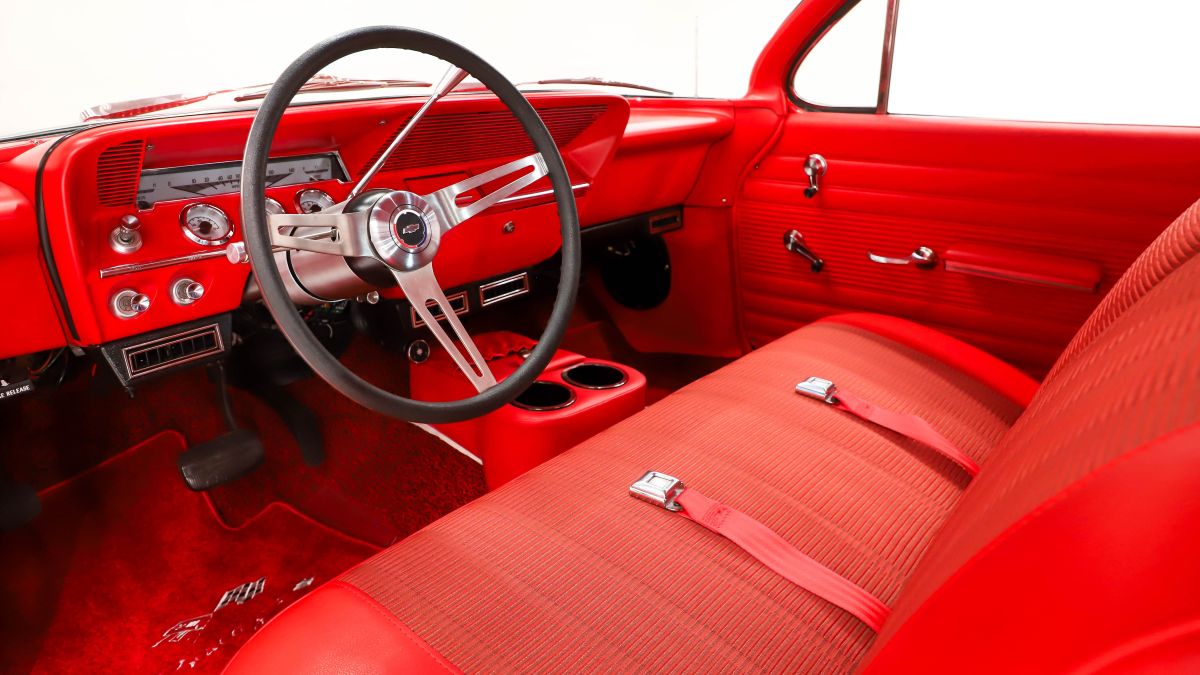 This Biscayne restomod was rotisserie-restored in “Ravishing Red.” Exterior features include quad headlights, a driver-side mirror, and chrome bumpers. Take note of the unique wrap-around rear window design, too. An aggressive, lowered stance was made possible by a four-corner air suspension, and footwork comes from a set of staggered 17/18-inch US Mags chrome wheels wrapped in General G-Max tires.