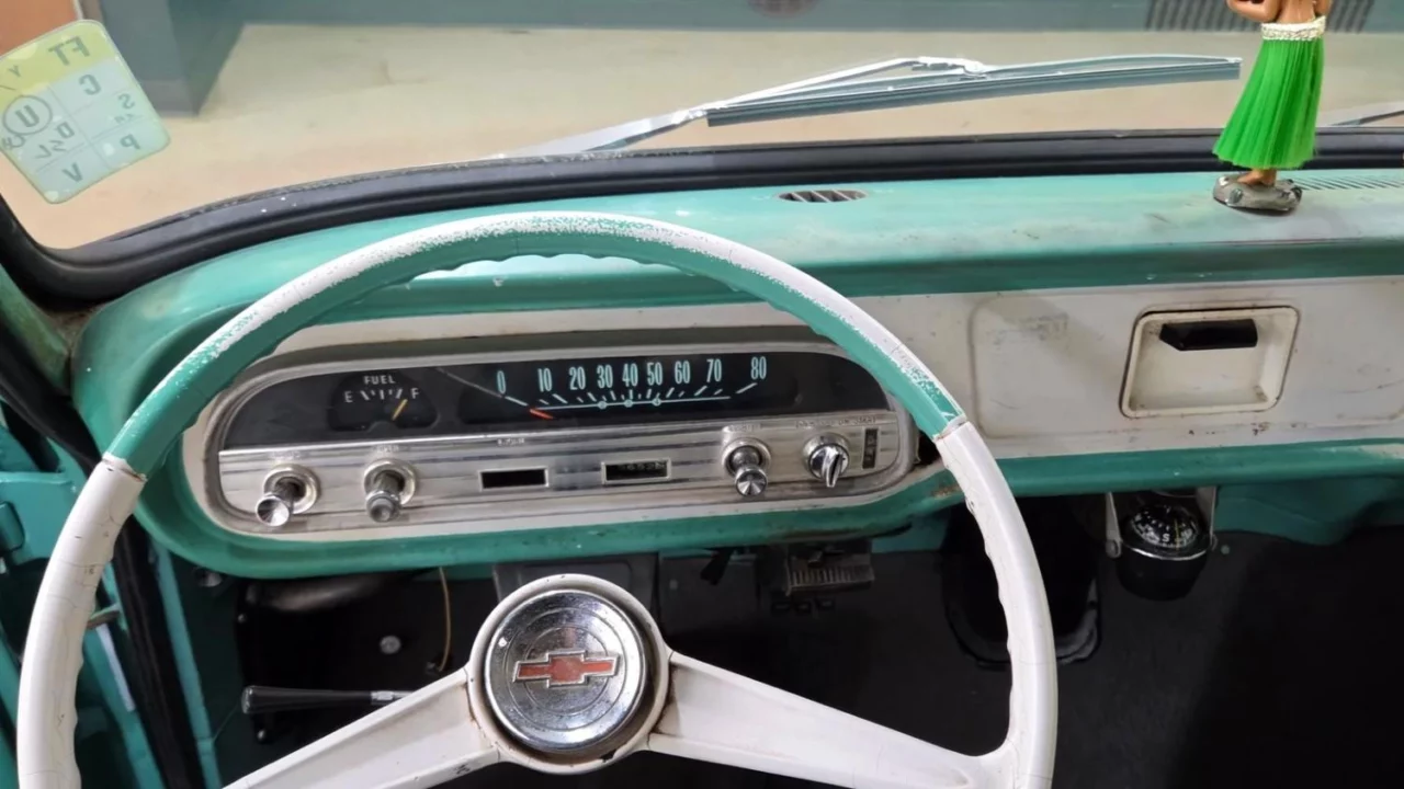The large cabin features white vinyl 60/40 folding front seats, and vinyl and patterned cloth upholstery for the second row. Other features include teal shag carpeting, compass, custom surfboard table, dash-mounted hula girl, and manual steering.