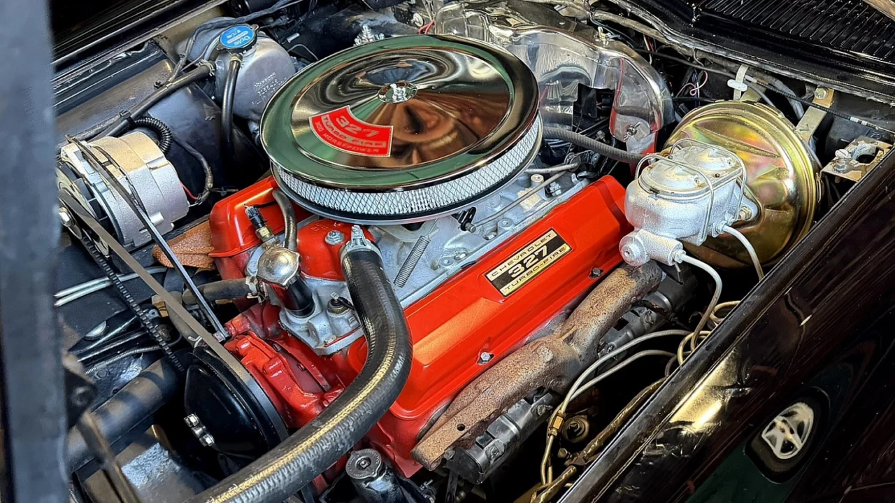 Under the front-hinged hood is a 327ci V8 that’s been upgraded with Holley Sniper electronic fuel injection. A Powerglide two-speed automatic sends the engine’s power to the rear end. The brakes have also been upgraded to power four-wheel discs.