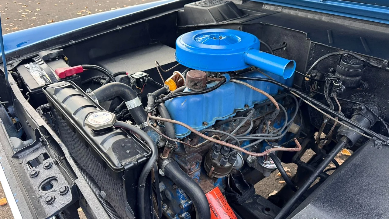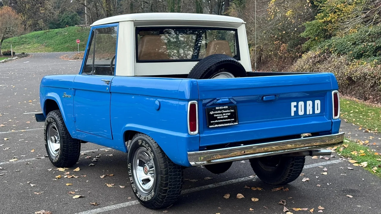 In its brochure for the 1966 Bronco, Ford identified this body style as the Sports Utility, which came with “a short steel roof, metal side doors and roll-up windows to provide complete weather protection.” If you ask me, it looks a lot like a pickup. Whatever you call this version of the Bronco, it doesn’t change the fact that it has been refinished in a combination of blue for the body and white for the grille and top during the restoration process.