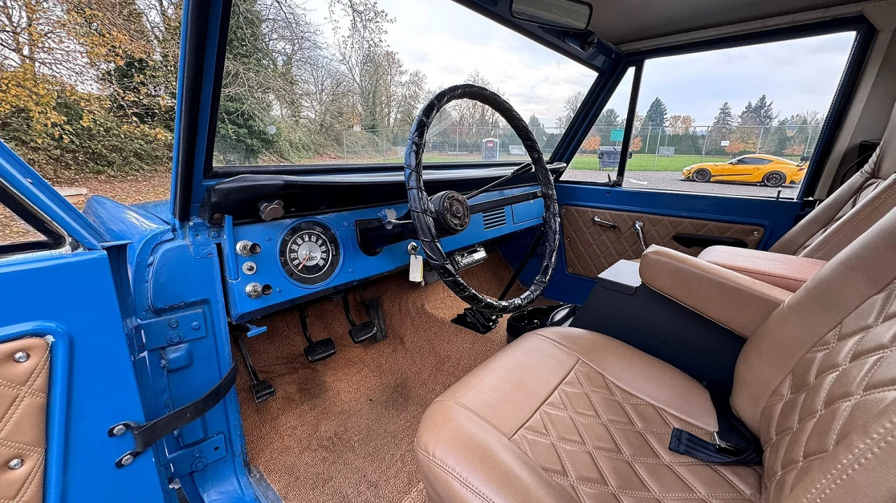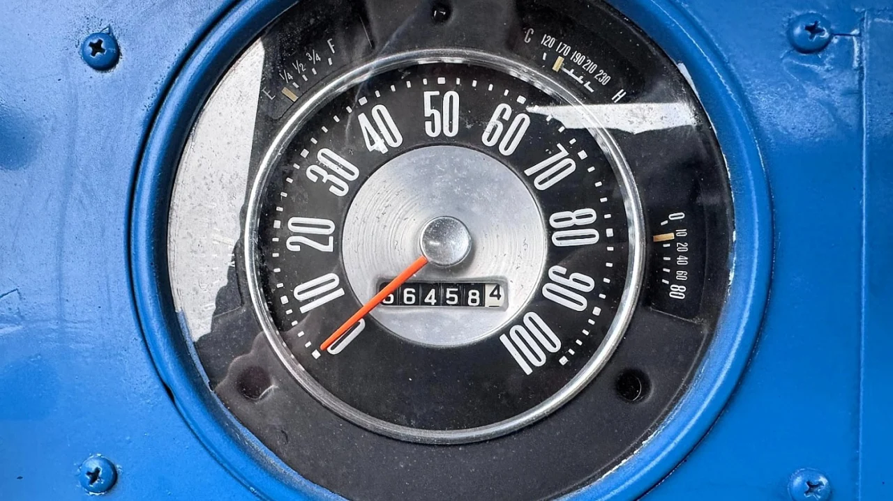Instrumentation consists of a 100-mph speedometer and gauges for the alternator, fuel level, temperature, and oil pressure. The odometer shows 66,458 miles, but this Bronco is mileage-exempt, according to its title.