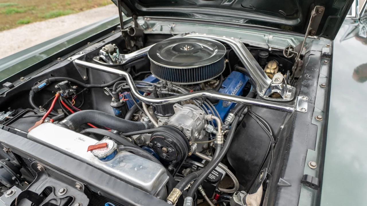 There are more changes under the hood, where the original engine was replaced with a 347ci V8, which has a rebuilt Holley 750cfm four-barrel carburetor, roller rockers, aluminum heads, aluminum radiator, and ceramic-coated headers. New parts include hoses, belts, plugs, gaskets, and ignition module. In addition, the factory transmission was replaced with a BorgWarner T5 five-speed manual gearbox.
