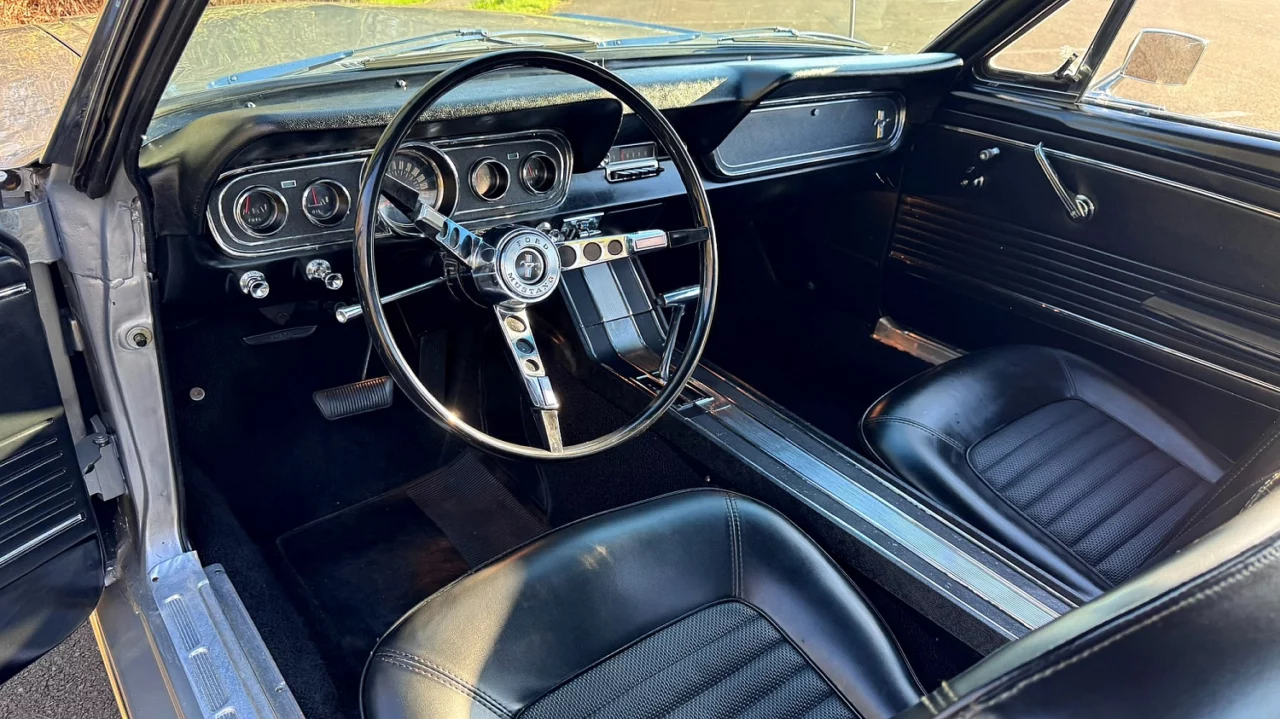 For 1966, the Mustang received visual updates which included a new five-gauge instrument panel. As the picture above shows, those gauges include a 140-mph speedometer and displays for the fuel level, oil pressure, amps, and temperature. The odometer indicates 24,008 miles, but this Mustang is mileage-exempt, according to its title.