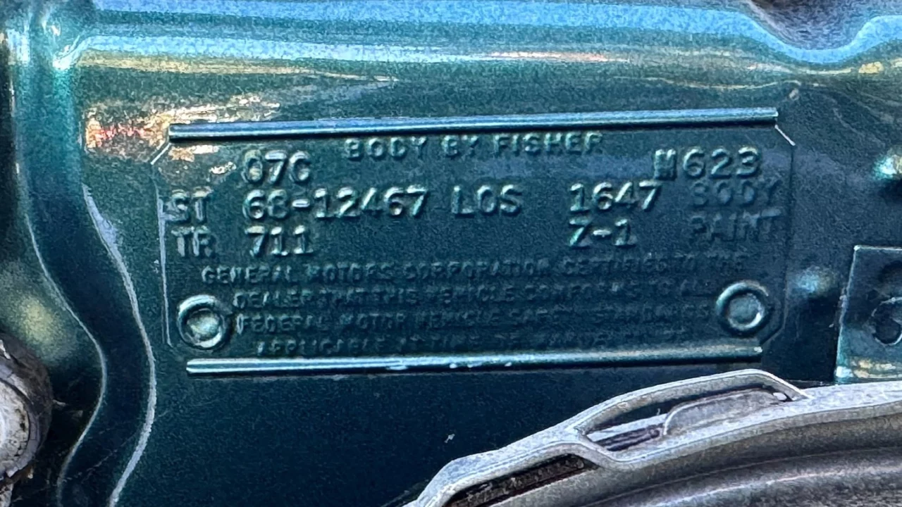 British Green was a mid-year introduction for the 1968 Camaro, one of three colors borrowed from the Corvette as part of a marketing push. It is complemented by a white convertible top. Other features include front and rear spoilers, hidden headlights (as part of the RS package), aftermarket Cowl Induction hood, chrome side mirrors, and black lower rockers. A set of 15-inch Rally wheels are fitted with staggered width radials — 215/60 up front, 265/50 out back.