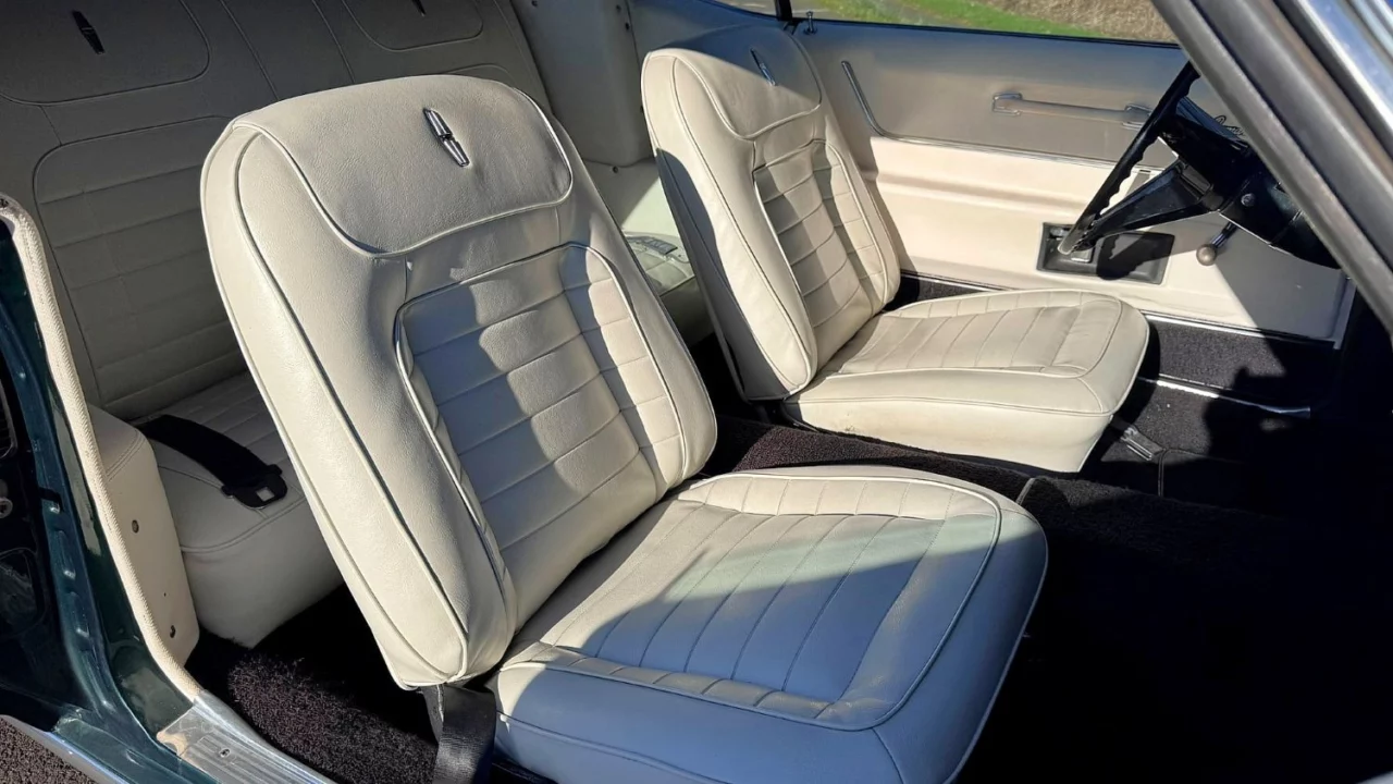 The cabin features the Custom interior in Ivory, which was a mid-year running change from Parchment. Bucket seats sans console means the automatic transmission shifter is on the column, which is a configuration not often seen. Other features include woodgrain trim, three-spoke steering wheel with power steering, fold-down rear seats, and aftermarket AM/FM stereo with cassette player.