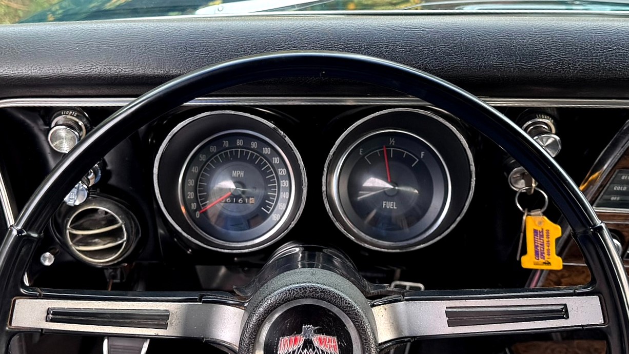 Instrumentation consists of a 160-mph speedometer and a fuel gauge. The odometer shows 6,161 miles, but this classic is mileage-exempt, according to its title.