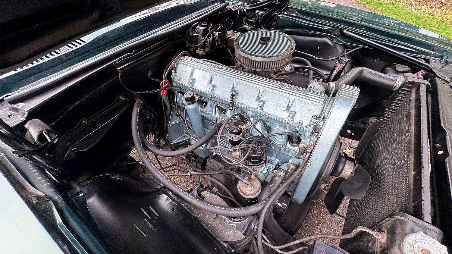 Between the front wheel wells is a 250ci OHC inline-six fitted with a four-barrel carburetor and connected to a two-speed automatic. A set of manual drum brakes slow that go.