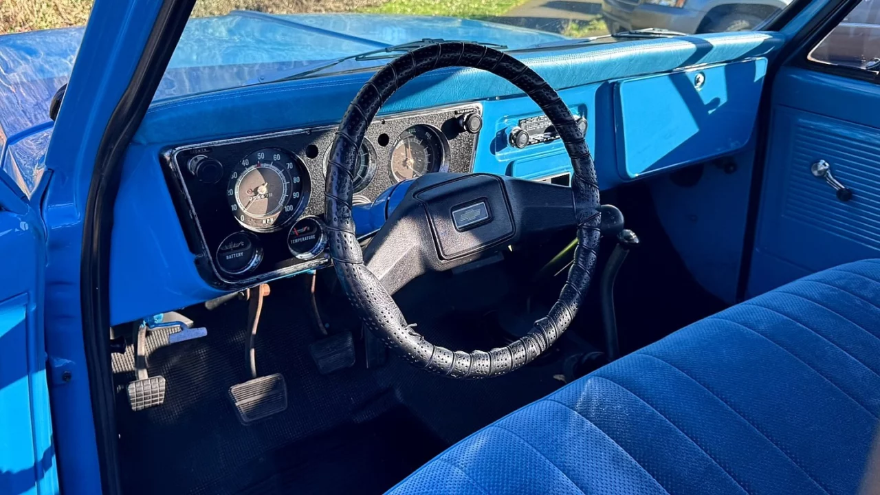 The cabin is just as colorful as the body. Nearly everything is blue, from the door panels to the dashboard, and the Blue cloth and vinyl bench seat. Features include power steering, floor-mounted manual transmission and transfer case shifters, and AM/FM radio.