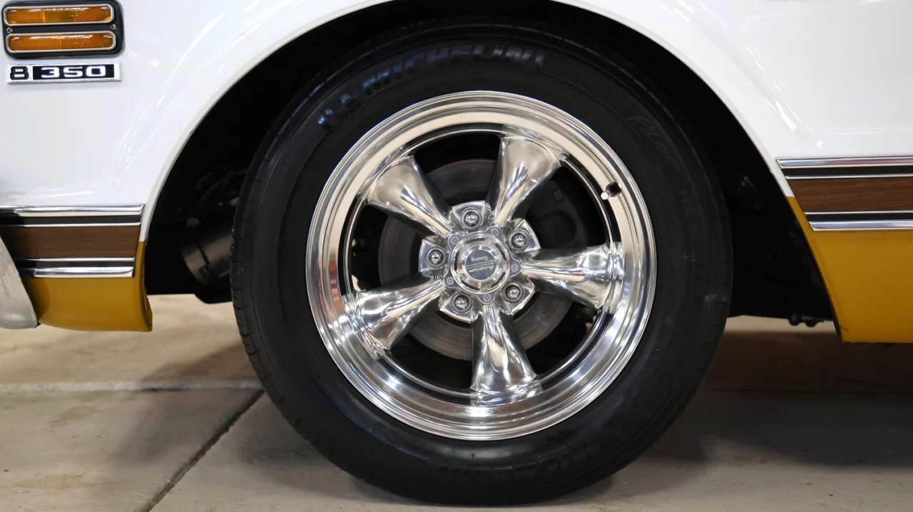 Under the hood is a BluePrint Engines 383ci stroker V8, which has 10:1 compression and comes equipped with a cast steel crankshaft, four-bolt main caps, aluminum heads, hypereutectic pistons, and hydraulic roller camshaft. On a dyno, the engine produces 436 horsepower. A 700R4 four-speed automatic transmission that was custom-built at Arnst Ocean Automotive in Delray Beach, Florida, sends the engine’s output to the 3.73:1 limited-slip rear end. Power front disc and rear drum brakes keep both ends of this truck pointed the right direction.
