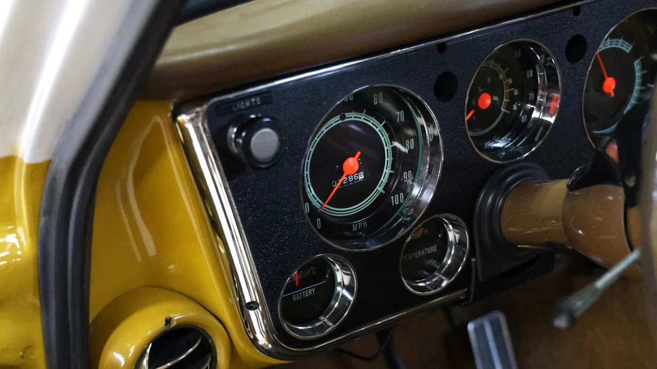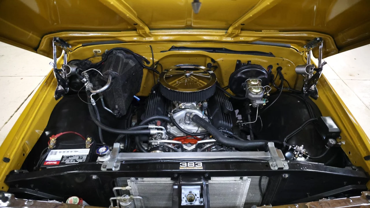 The body’s Spanish Gold flows into the cabin, where it’s complemented by brown door cards with woodgrain inserts, a brown dash pad, wood-rimmed steering wheel, brown carpeting, and brown vinyl bench seat with yellow and black houndstooth cloth inserts. Power steering, air conditioning, and Pioneer AM/FM/CD/USB/AUX stereo add convenience and comfort to all that style.