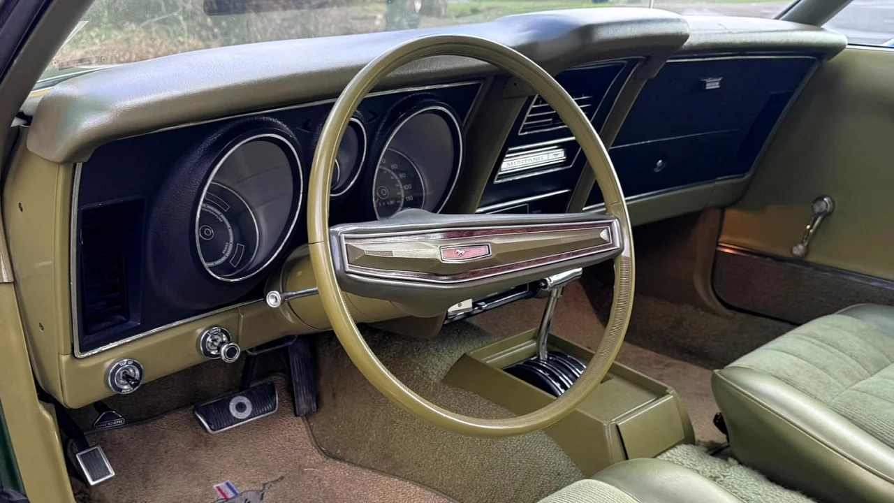 In between the Avocado knitted vinyl bucket seats is a shifter for the C4 automatic transmission, plus factory air conditioning and AM radio can be found in front of the shifter. The two-spoke steering wheel is connected to a manual steering system. Overall, the condition of the interior looks great and I see no needs whatsoever.