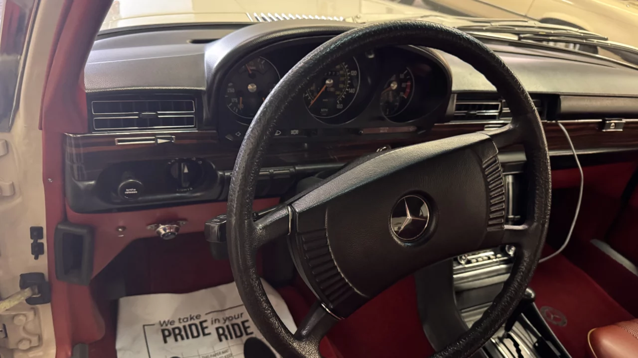 Judging by this car’s exterior, it seems as if it is a bit of a time capsule. The paint and brightwork look excellent, the glass appears to be flawless, and all the indicator lenses are in good shape as well. The small bumpers on these early W116 S-Class sedans only help to make it look amazing, especially when compared to later U.S.-market examples. The car rides on correct 14-inch factory steel wheels with correct painted Mercedes-Benz hubcaps.