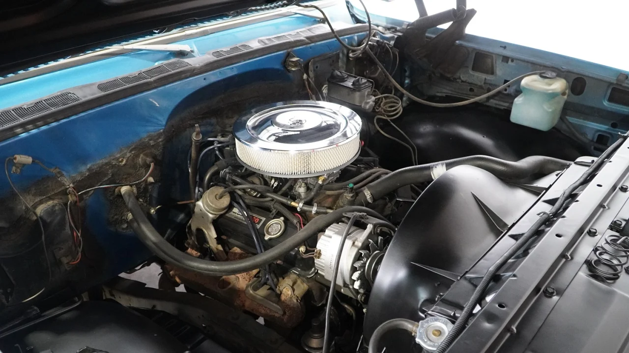 In 2000, the original four-barrel 350 was replaced with a GM Goodwrench 350ci V8 crate engine, which is equipped with a Holley 670cfm four-barrel carburetor and heavy-duty four-row radiator. The engine sends power to the 3.07:1 rear end through a rebuilt TH350 three-speed automatic.