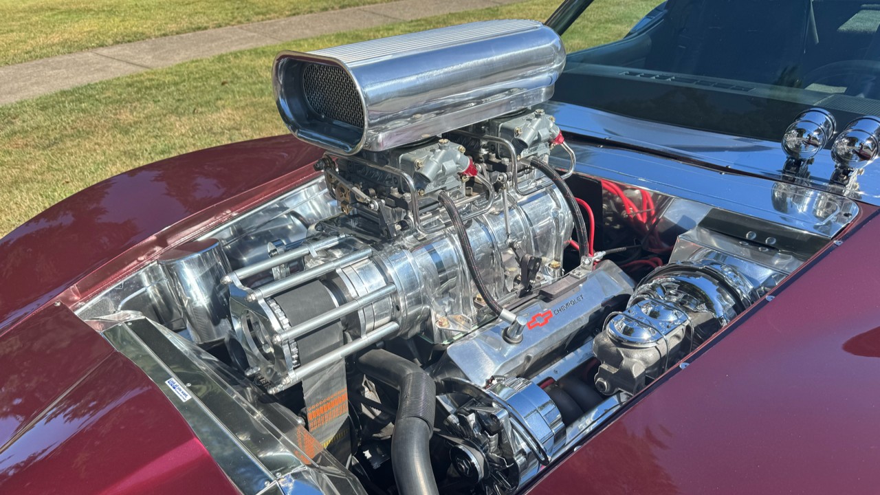 It only takes a quick glance at this Corvette to see that it means business when it comes to performance. The engine is the predominant feature of the build – towering out of the nose in all its chromed-out glory. A spec list gives us some insight as to the nuts and bolts that bring it all together: The 355ci V8 is supercharged using a “Big Al’s” Roots-style supercharger, and features include dual Holley 750cfm carburetors, Iron Eagle Dart heads, a BDS blower, Hooker long-tube headers, and plenty of shiny dress-up bits. It’s a work of art. Power is fed to the rear tires via a robust Muncie M22 four-speed manual transmission and a 12-bolt Positraction rear end.