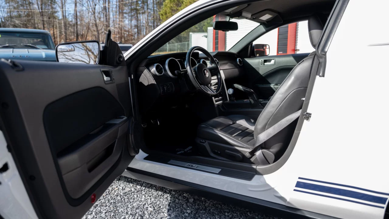 Features of this low-mileage GT500’s Performance White exterior include a “power dome” hood, Vista Blue striping, GT500 rocker decals, rear window louvers, and a flush-mounted rear spoiler. The car is said to be free of imperfections, and most importantly, it’s original. A good number of the Shelby-built cars likely went on to become modified track machines. Each Shelby Mustang was individually serialized with a dash plaque containing the car’s VIN and a representation of Carroll Shelby’s signature.