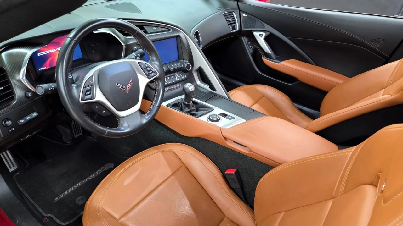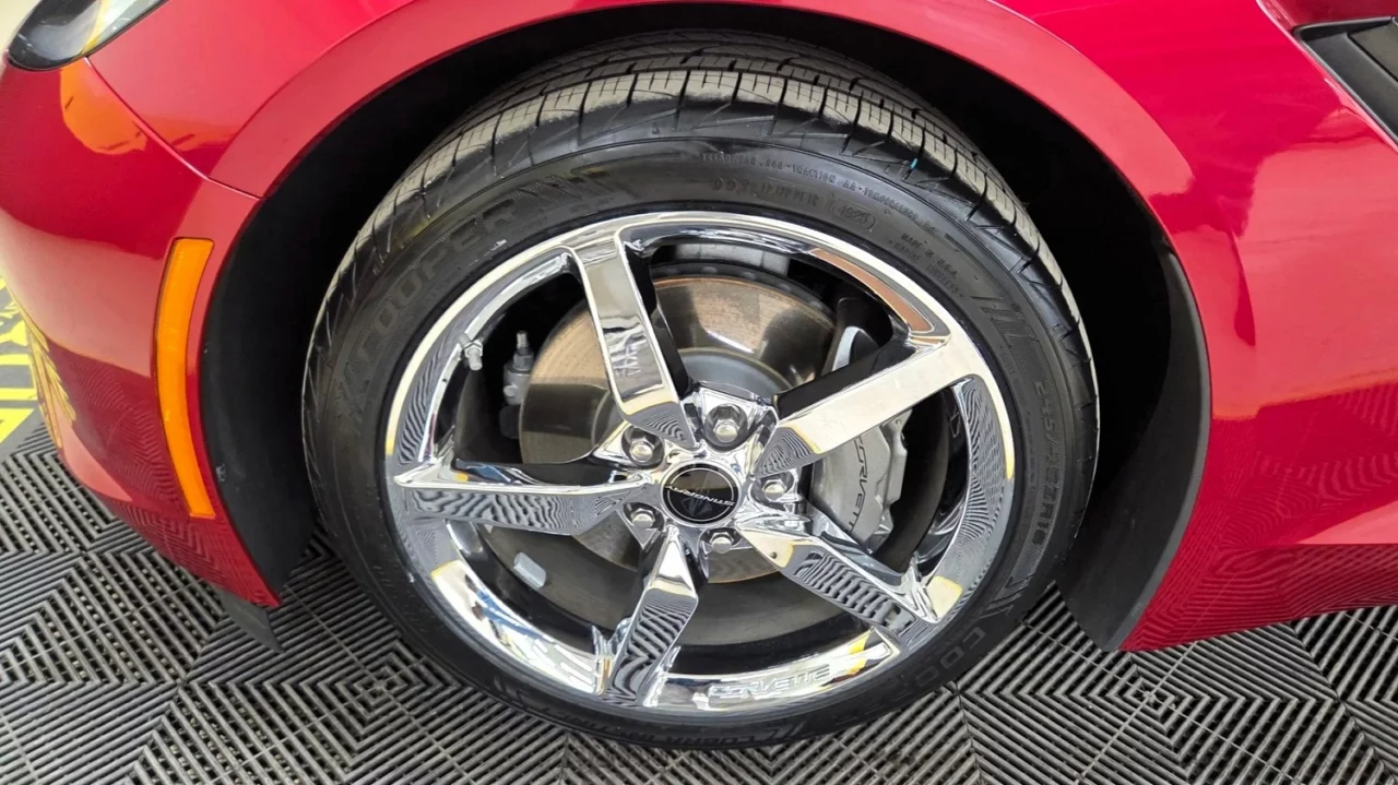 An LT1 6.2-liter V-8 with 455 horsepower and 460 lb-ft of torque lights up the rear tires. A TREMEC TR-6070 seven-speed manual with Active Rev Matching sends that firepower to the rear wheels. Four-wheel ventilated disc brakes with ABS keep this Corvette’s tires firmly on the road or track.