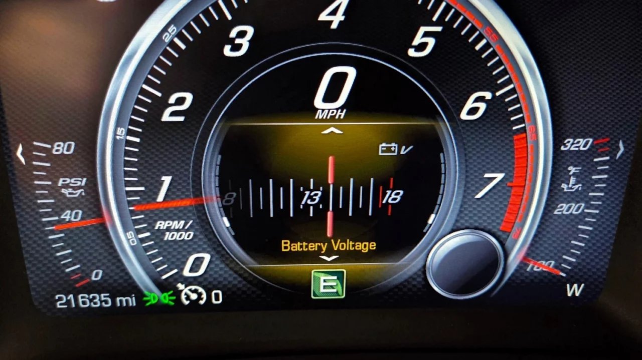 The digital gauge cluster includes a speedometer, 7,500-rpm tachometer, and readouts for the fuel level, oil pressure, voltage, oil temperature, and more. The digital odometer shows 21,635 miles; according to the AutoCheck report, the last mileage figure of 17,992 miles was logged in May 2021.