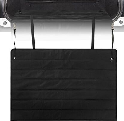 Its foldable design allows it to serve multiple roles, functioning as a bumper shield, a temporary cargo liner, or a high-friction mat for dogs. Installation is straightforward using two adjustable straps and buckles that anchor to the trunk, while integrated fastener tape allows the mat to be quickly folded and stowed when the trunk is closed.