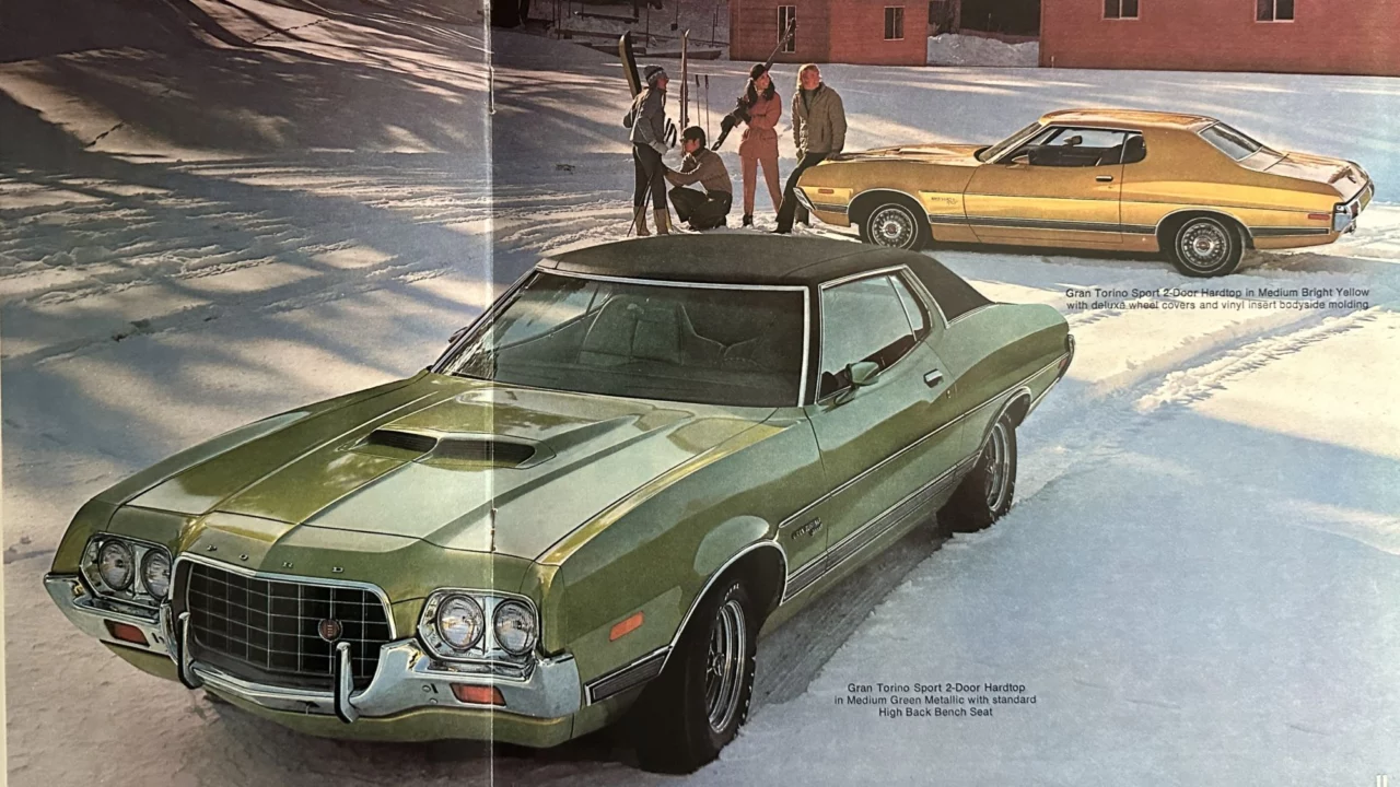 The brochure for 1972 models said, “Each Gran Torino Sport gives you lines that say action and mean it. With emphasis like integral hood scoops, dual racing mirrors, wide-oval white sidewalls, sporty trim rings with hub caps, and a jaunty new oval grille.”