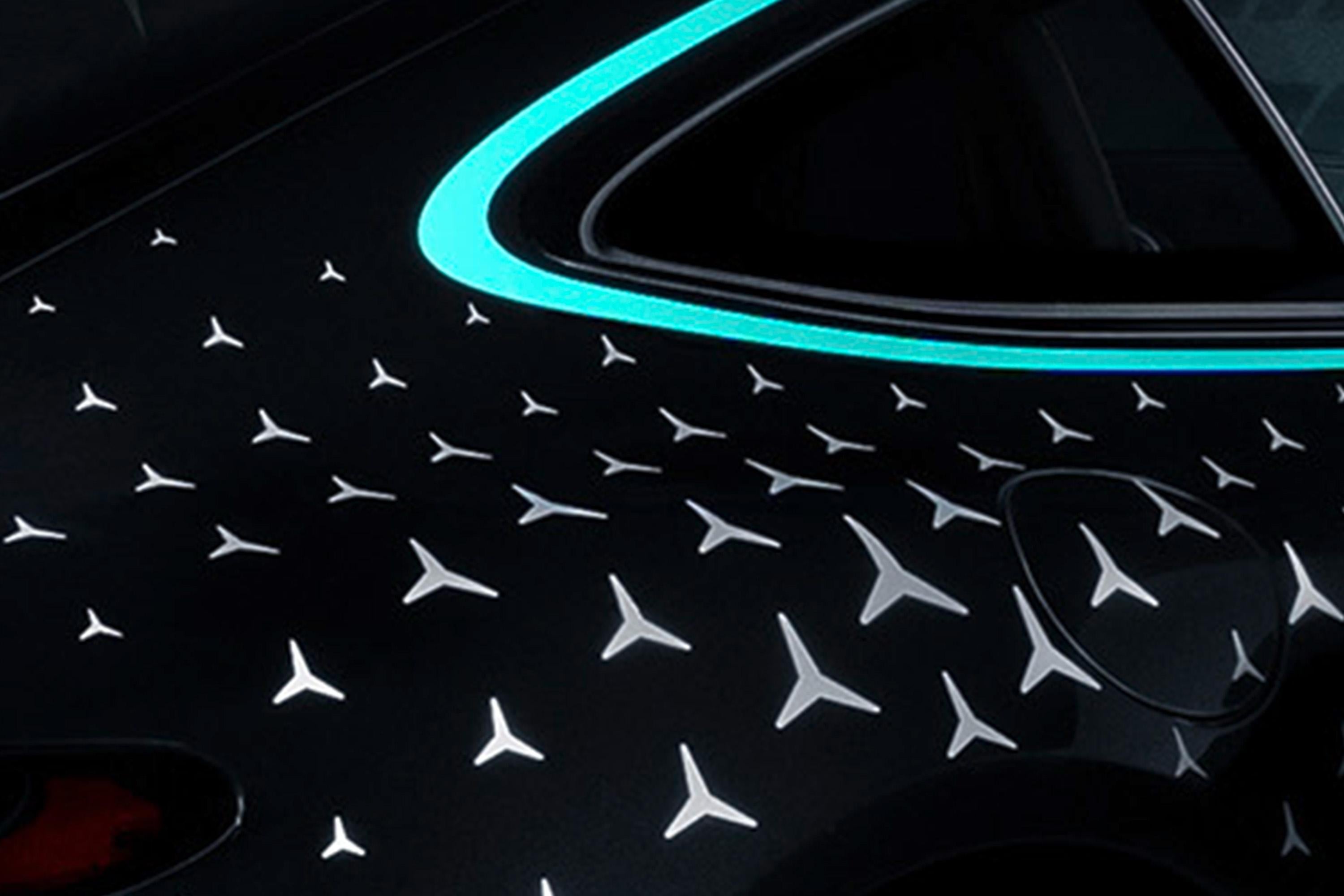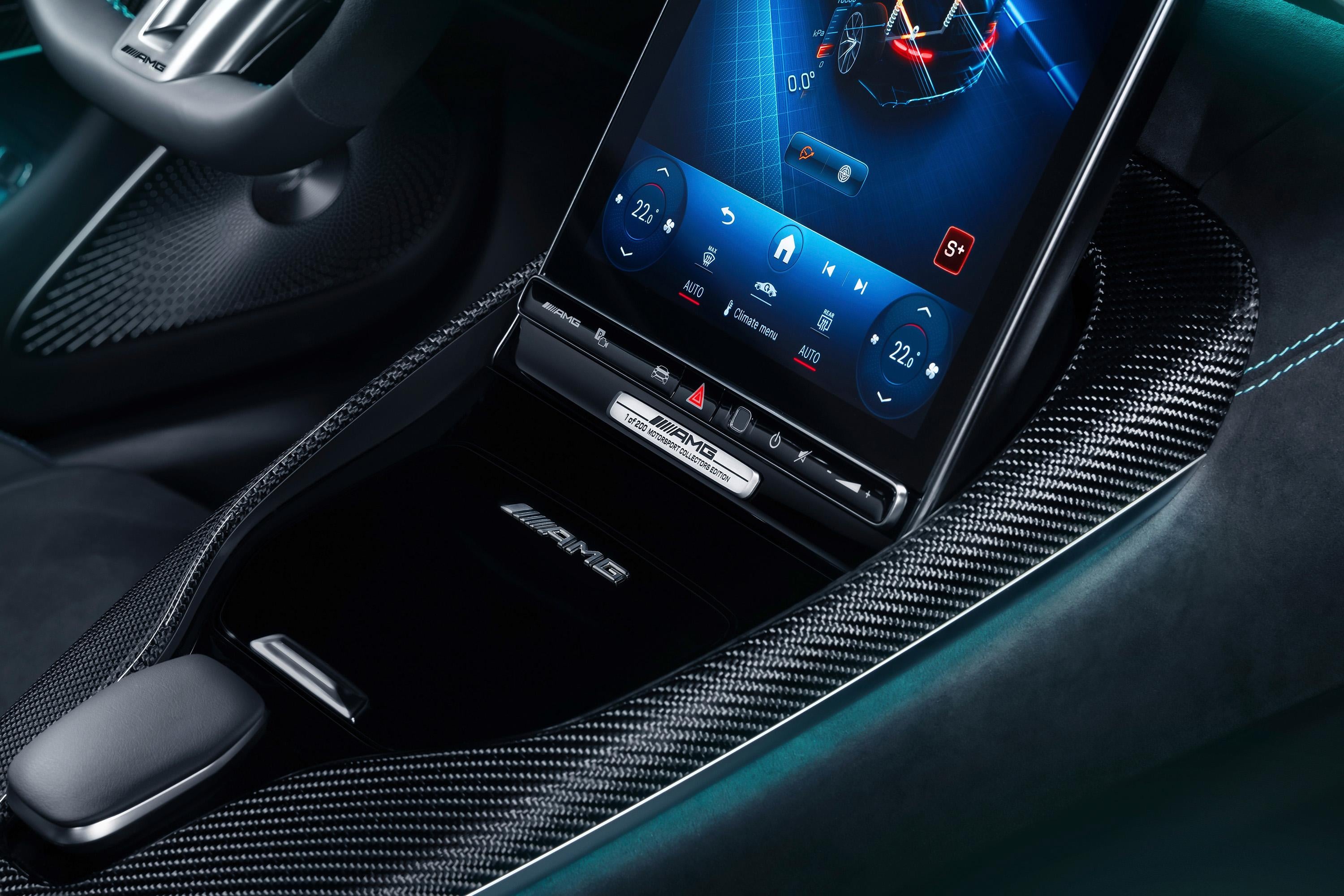 Inside, Petronas green is used on the illuminated door sills, as well as stitching on the doors, console, leather/microfibre steering wheel and Nappa leather seats, which have AMG-embossed headrests.