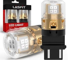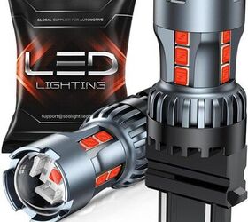 These pure red LED bulbs come in a pair and have the proper seat to fit the wiring sockets on our fictional F-150. A series of LEDs all around the bulb surface should provide much better illumination characteristics than one with peepers just on the end.
