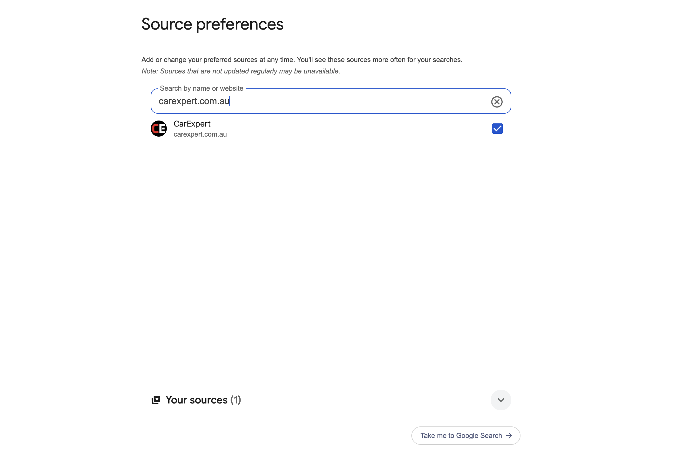 Simply click on Add preferred source and it’ll take you to your Google source preferences page. Type carexpert.com.au in the field, check the box next to it, and you’re done! You can return to Googling by pressing Take me to Google Search.