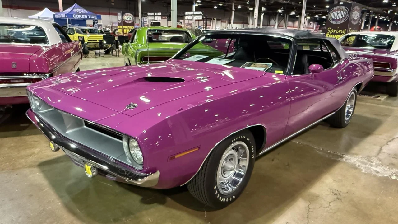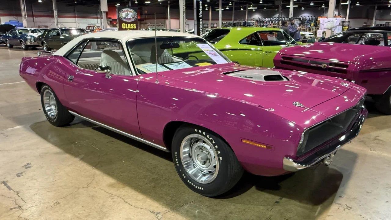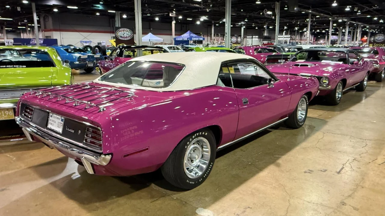 At least three 1970 ‘Cuda convertibles were painted Moulin Rouge. This one is powered by a 340 engine.