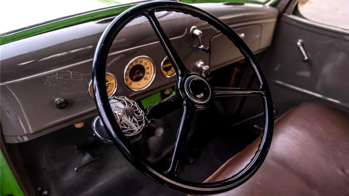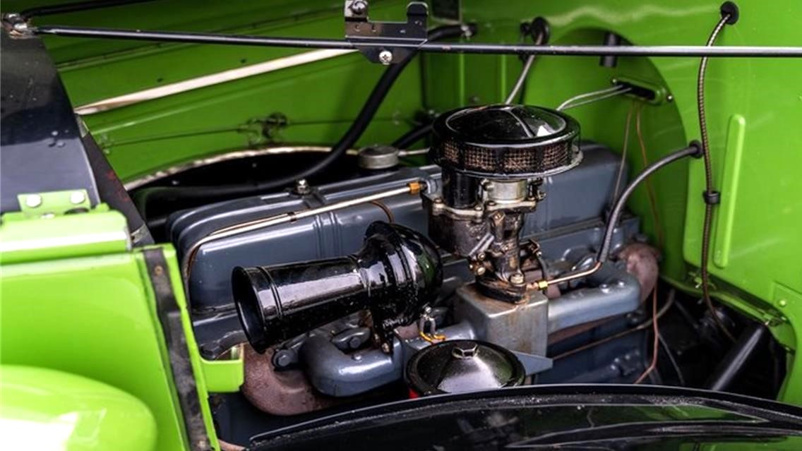 This Master JC from the late 1930s is no exception. Its tall vertical grille and two-piece windshield give it a dramatic presence while the curved fenders add distinctive touches of grace and elegance. The basic design would look great even with a heavy patina but, within the past several decades, this pickup received a body-off restoration—twice. The first one was carried out between December 1979 and November 1985. The second one started in April 1999 and concluded in November 2001, resulting in the current apple green and black color combo with wood bed slats and side rails. As if this truck wasn’t head-turning enough already, its wheels are the same green as the body, accented with chrome hub caps and wrapped in wide whitewalls.