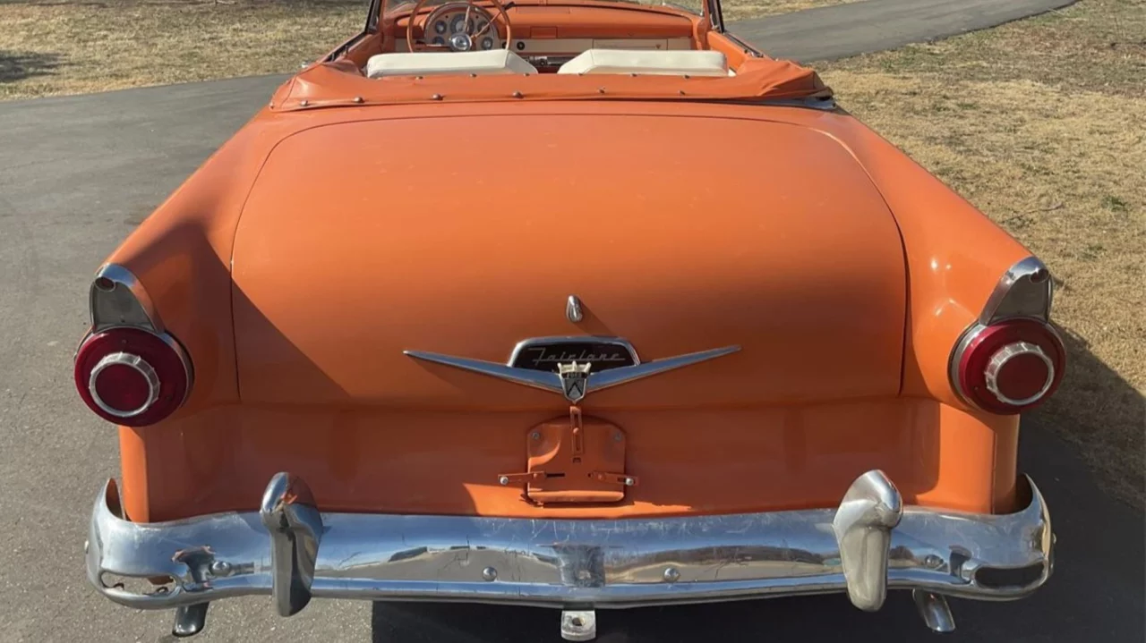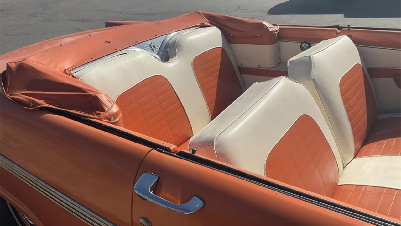 This Sunliner is described by the seller as an “amazing survivor.” The listing says, “Purported to be a one-owner before I purchased it. One of the nicest I have seen.” While many cars from the 1950s had two-tone paint schemes, the monochromatic Mandarin Orange look works well on this one. Features include chrome brightwork, antenna, sweeping side spears, color-matched steel wheels, and full-size hubcaps.