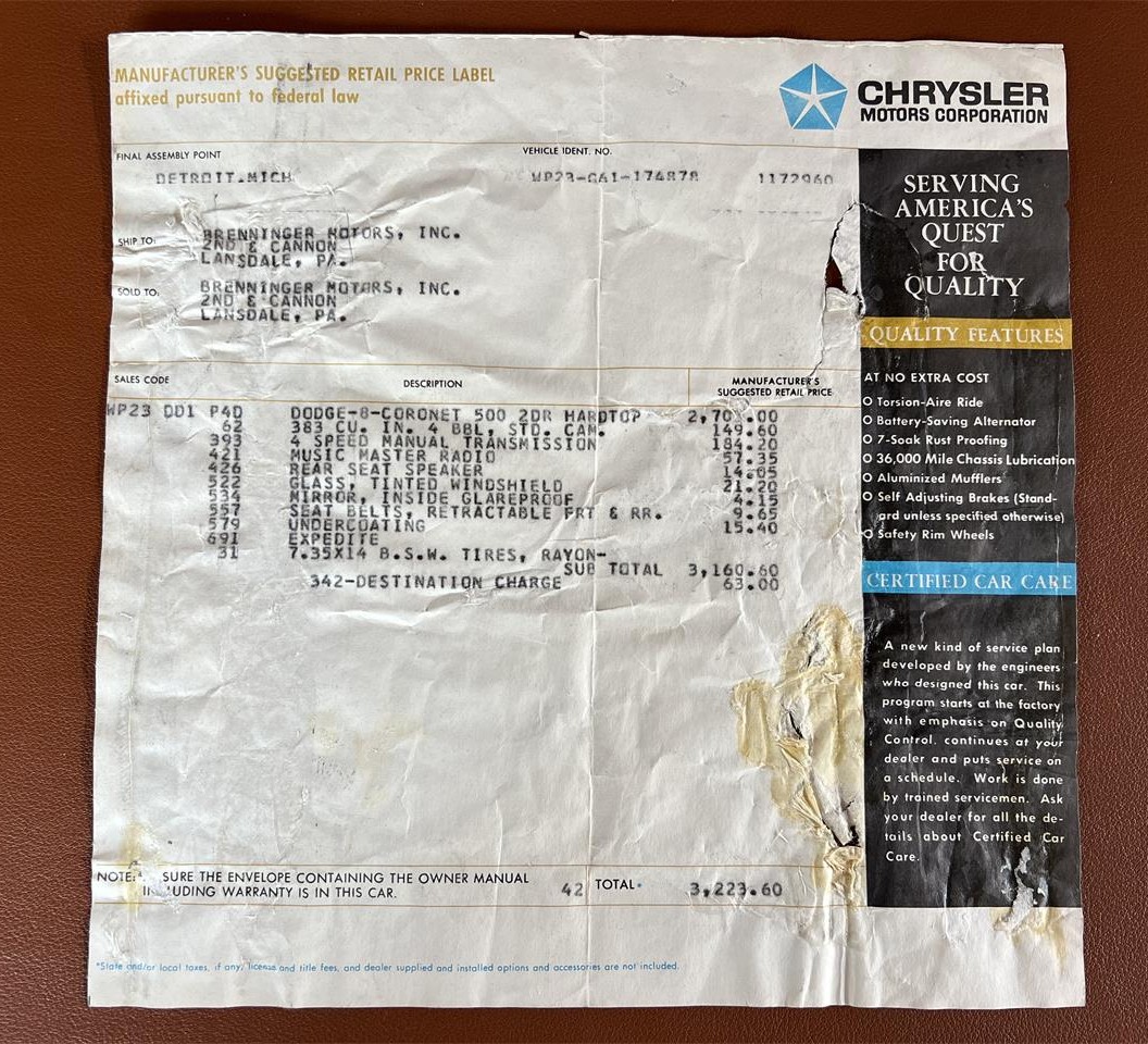 Chrysler finally followed the proper formula for 1967 with the introduction of the Dodge Coronet R/T (and its cousin, the Plymouth GTX). Chrysler wised up and included a standard 440 as well. And the lowly 383? For 1968, it received some upgrades that added five horsepower in 1968, but a special mid-year model called the Super Bee added another five to that . . . but that’s another story for another day.