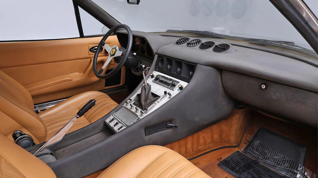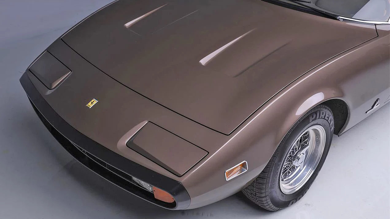 The car featured here is one of 505 365GTC/4s built. It is finished in Marrone Colorado (“reddish brown”) over a tan leather interior. The condition of the exterior looks excellent in every way. Some folks haven’t warmed up to the exterior styling of the 365 GTC/4 but, in the right colors (anything but red), these cars can look striking. They have a lot of the DNA of the Daytona but are a bit softer. The side view is especially amazing.