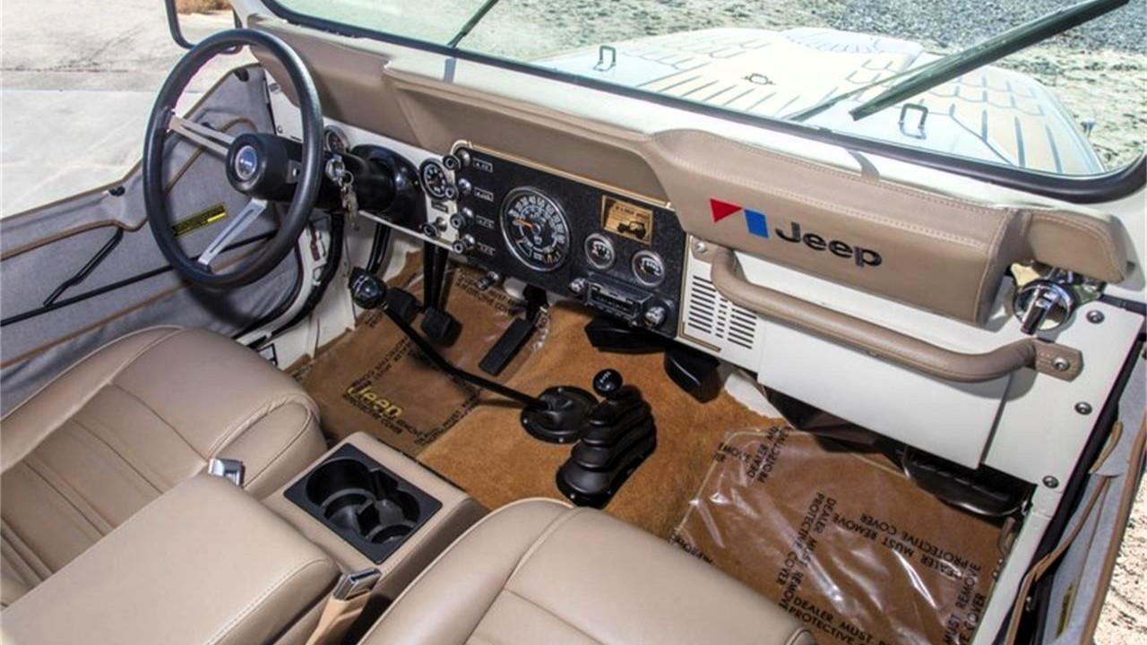 That was a long time ago — especially for an off-roader like this CJ-7. Fortunately, after it was purchased by the previous owner in 2020, it received a comprehensive restoration/customization, which now has less than 4,000 miles on it. According to the selling dealer, “The factory steel tub was repainted in basecoat/clearcoat Wimbledon White after which a replacement windshield, black fender flares, side mirrors, lighting, decals, and a Kentrol front bumper were installed.” A tan bikini-style Bestop soft top and removable soft half-doors keep out the elements.